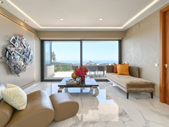 Upstairs, five beautifully styled bedrooms each reflect a unique aesthetic. Offering the ambience of luxury hotel suites with custom design details and high-end finishes. Three include en-suite bathrooms, and enjoy spectacular sea views, while two look out over the peaceful mountains. A dedicated office area and intimate seating area provide functionality and flexibility for daily life.