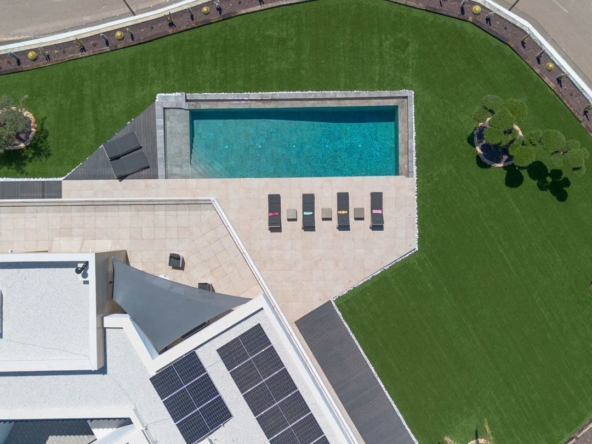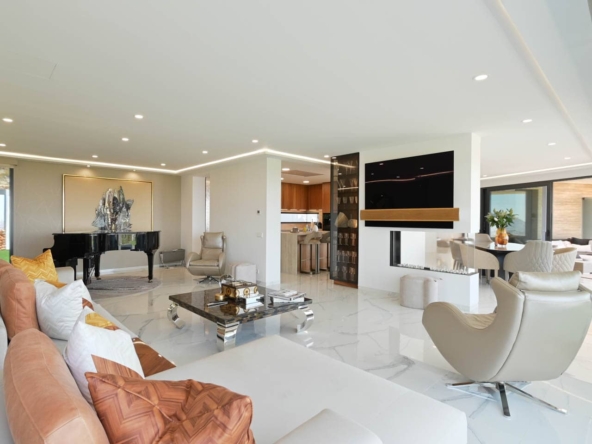 From the moment you enter, the home reveals its considered design — full of natural light, flowing volumes, and a seamless connection between interior and exterior spaces. The open-plan kitchen, dining area, and lounge form the heart of the home, designed for both relaxed family living and elegant entertaining. Full-height sliding glass doors open entirely onto the terrace, creating a continuous indoor-outdoor experience.