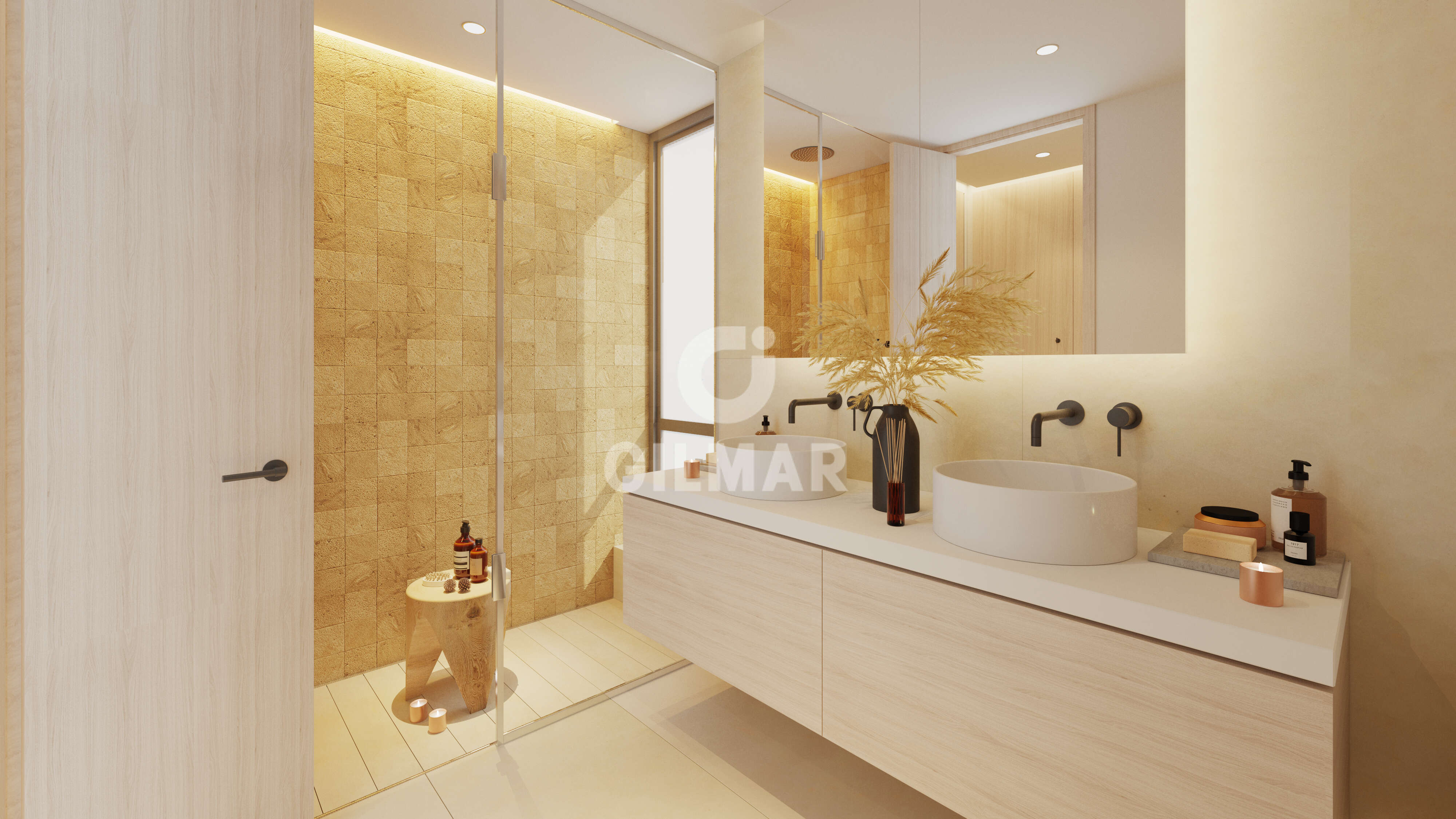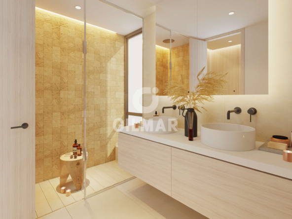 The master bedroom, a private oasis of calm, boasts dramatic large-format ceramic walls that echo the natural beauty of the surroundings. Wake up to the glow of the sunrise dancing on the water and step out onto your terrace to breathe in the crisp, salty air.