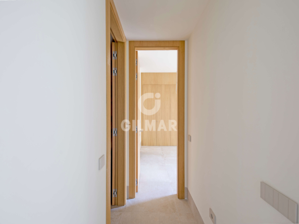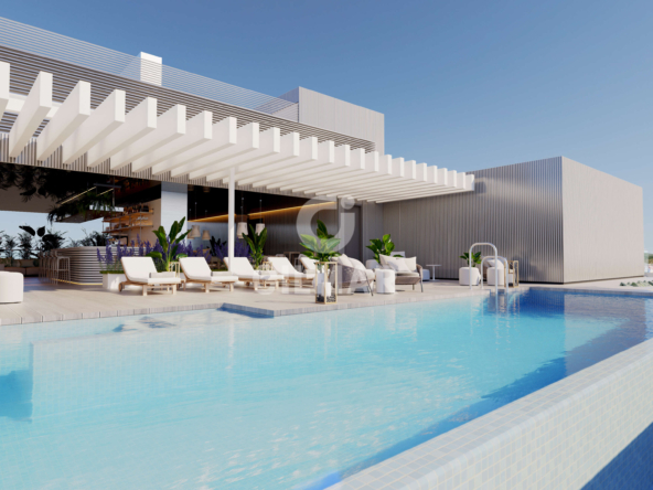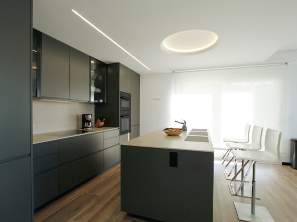 An expansive 80 sqm open-plan living, dining, and kitchen area welcomes you with timeless elegance. The kitchen, a masterpiece by Porcelanosa, effortlessly flows into a sunlit living room. Glass doors slide open, extending your space to a 150 sqm terrace that seems to float above the Mediterranean. The infinity pool shimmers invitingly, while a dedicated kitchen terrace and staircase lead you to a rooftop solarium and a verdant garden below.