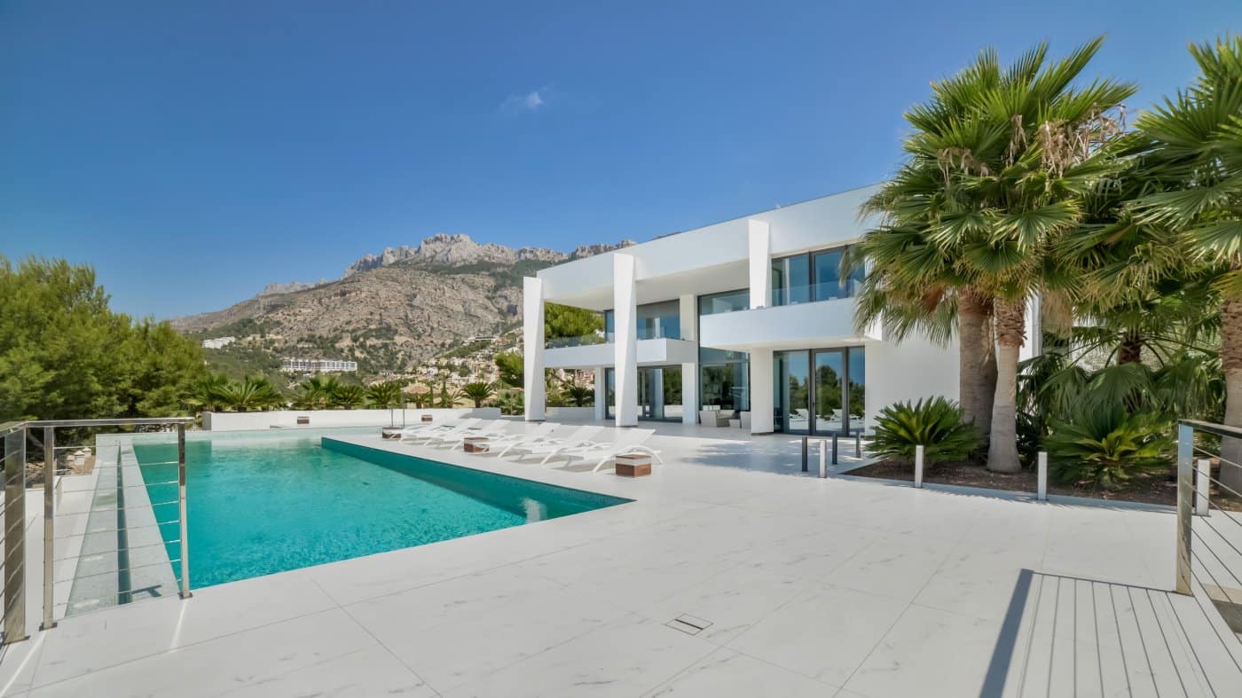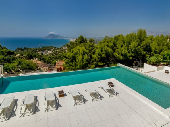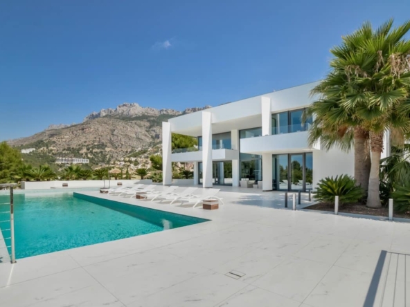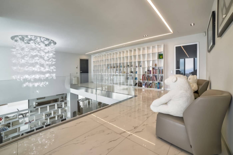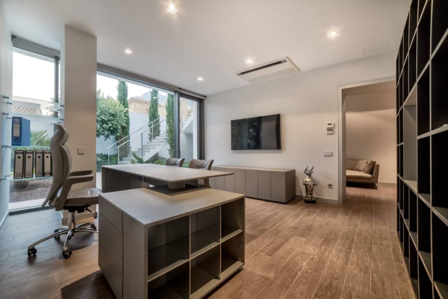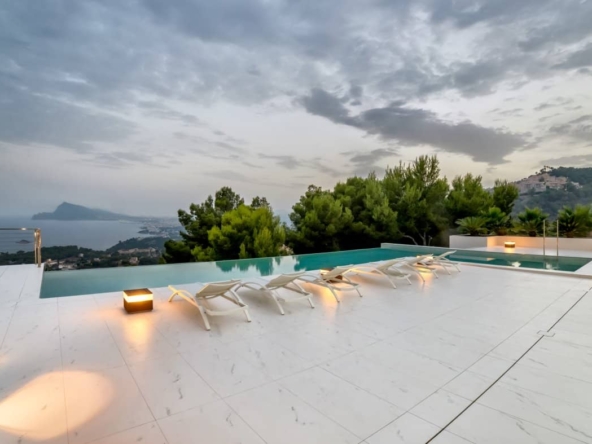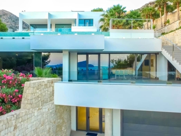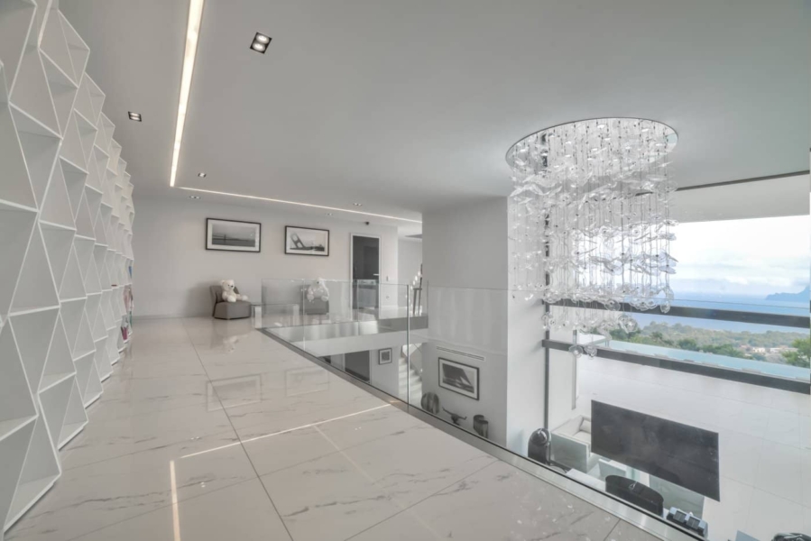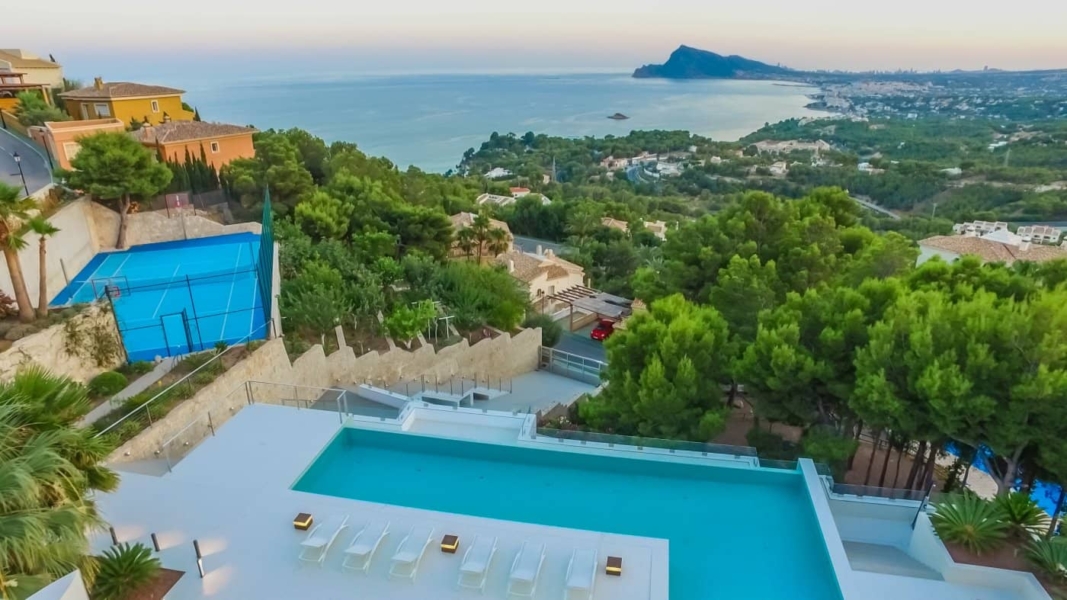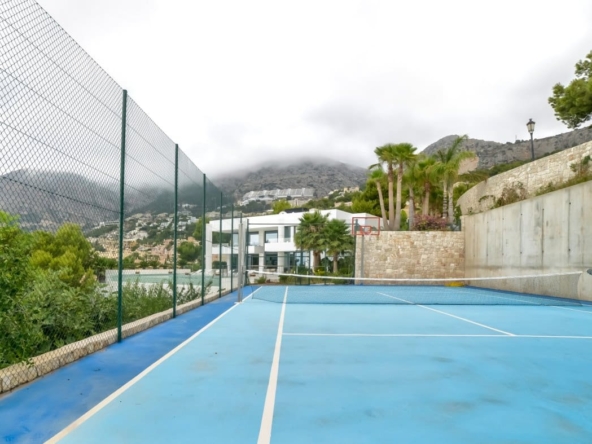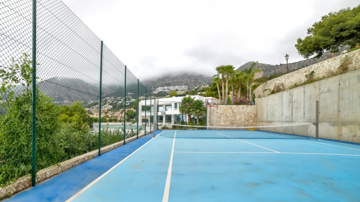 Spectacular luxury villa for sale in Altea Hills. This stunning villa enjoys spectacular panoramic views of the sea and sun all day (South orientation). It is located in a private urbanization with restricted access (very quiet area), 3,5 Km from the sea (Marina Greenwich Yacht Club), near the urban centre of Altea. It is located on three building plots of total 3.080 m2 and has a total constructed area of 1.800 m2 distributed over several floors (with elevator), as follows: on the main floor we have 1 guest toilet, a dressing room of 15 m2, very large open plan living room kitchen of 200 m2 (with fireplace) which gives access to the fabulous outdoor terrace of 250 m2 where we have an incredible pool of 120 m2 with self cleaning and salt system and a tennis court. On the ground floor we have 3 independent areas, the first area has a large dining room kitchen of 60 m2, indoor pool of 36 m2, jacuzzi, gym of 25 m2, beauty salon with hairdresser included of 20 m2, finnish sauna for 6 people, turkish sauna for 6 people, double shower, 1 guest toilet and a wine cellar. The second area is an apartment for the service that consists of an open plan living room kitchen, 1 bedroom, 1 bathroom and a laundry room. The third area would be the guest area that has 3 large bedrooms (25 m2 + 25 m2 + 35 m2), 3 en suite bathrooms, 70 m2 game room, 40 m2 movie theatre (completely soundproofed), 30 m2 office, 50 m2 facilities room and 1 guest toilet. In the basement we have the garage of 75 m2 for 3 vehicles. On the upper floor we have 3 large bedrooms (30 m2 + 25 m2 + 30 m2), 3 large bathrooms en suite (25 m2 + 12 m2 +12 m2), 1 dressing room of 10 m2 and 2 private terraces (10 m2 + 15 m2). This luxury villa has been built in 2016 and is in perfect condition. It is equipped with all the luxuries you can imagine, fendi furniture included, high quality carpentry, ducted air conditioning, underfloor heating, elevator, alarm with security cameras, high end tiles, fully equipped designer kitchen (Gaggenau), Fully equipped designer bathrooms, solar panels, LED lighting, etc. The garden is very beautiful and surrounds the house with fruit trees and tropical trees, in addition, it is low maintenance (automatic irrigation). It also has large outdoor spaces for many vehicles. Without doubt one of the most luxurious villas on the Costa Blanca.