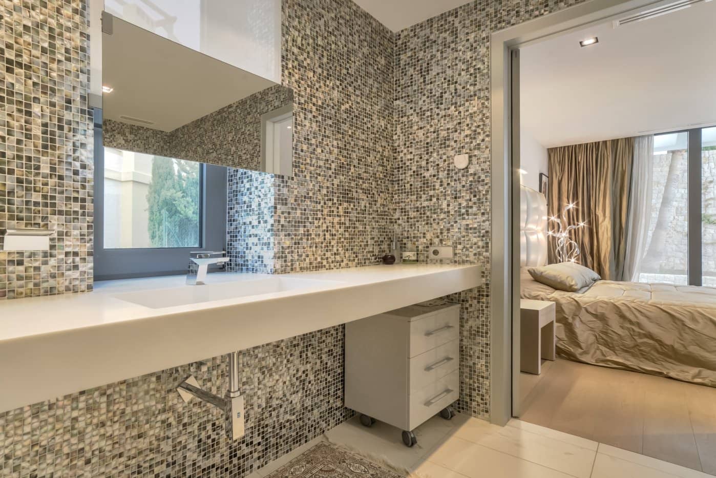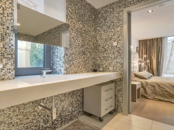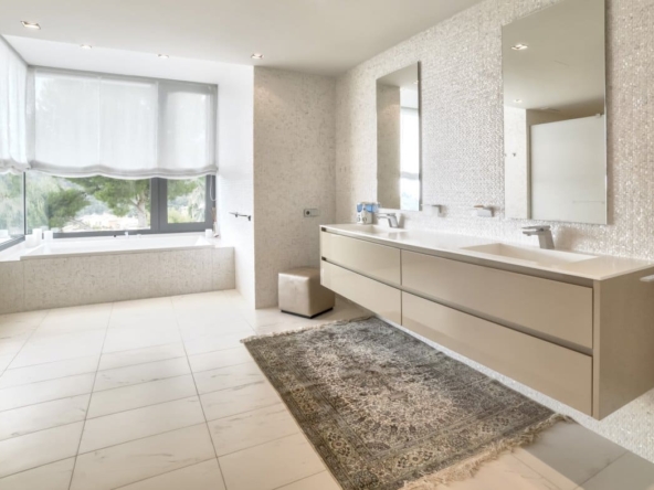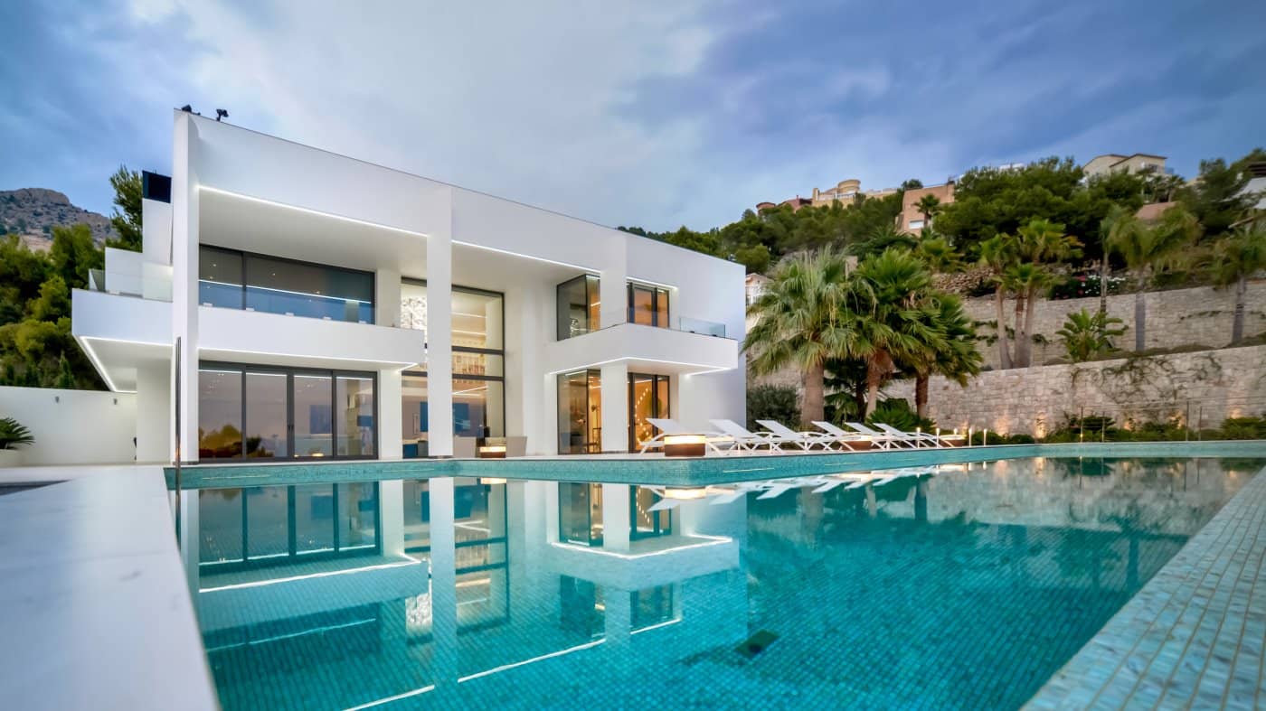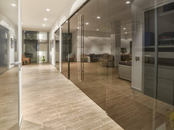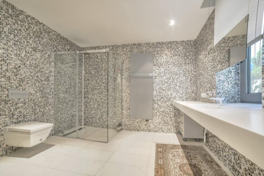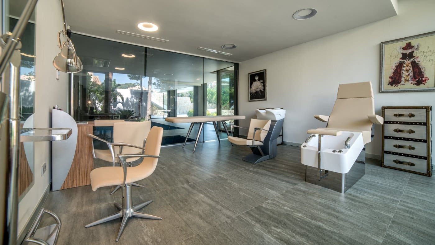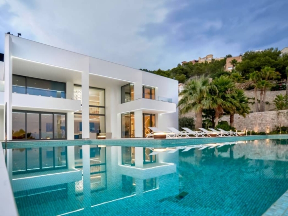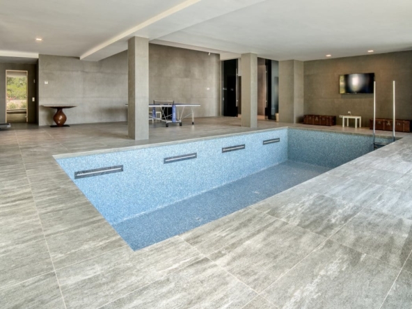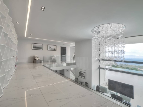 Spectacular luxury villa for sale in Altea Hills. This stunning villa enjoys spectacular panoramic views of the sea and sun all day (South orientation). It is located in a private urbanization with restricted access (very quiet area), 3,5 Km from the sea (Marina Greenwich Yacht Club), near the urban centre of Altea. It is located on three building plots of total 3.080 m2 and has a total constructed area of 1.800 m2 distributed over several floors (with elevator), as follows: on the main floor we have 1 guest toilet, a dressing room of 15 m2, very large open plan living room kitchen of 200 m2 (with fireplace) which gives access to the fabulous outdoor terrace of 250 m2 where we have an incredible pool of 120 m2 with self cleaning and salt system and a tennis court. On the ground floor we have 3 independent areas, the first area has a large dining room kitchen of 60 m2, indoor pool of 36 m2, jacuzzi, gym of 25 m2, beauty salon with hairdresser included of 20 m2, finnish sauna for 6 people, turkish sauna for 6 people, double shower, 1 guest toilet and a wine cellar. The second area is an apartment for the service that consists of an open plan living room kitchen, 1 bedroom, 1 bathroom and a laundry room. The third area would be the guest area that has 3 large bedrooms (25 m2 + 25 m2 + 35 m2), 3 en suite bathrooms, 70 m2 game room, 40 m2 movie theatre (completely soundproofed), 30 m2 office, 50 m2 facilities room and 1 guest toilet. In the basement we have the garage of 75 m2 for 3 vehicles. On the upper floor we have 3 large bedrooms (30 m2 + 25 m2 + 30 m2), 3 large bathrooms en suite (25 m2 + 12 m2 +12 m2), 1 dressing room of 10 m2 and 2 private terraces (10 m2 + 15 m2). This luxury villa has been built in 2016 and is in perfect condition. It is equipped with all the luxuries you can imagine, fendi furniture included, high quality carpentry, ducted air conditioning, underfloor heating, elevator, alarm with security cameras, high end tiles, fully equipped designer kitchen (Gaggenau), Fully equipped designer bathrooms, solar panels, LED lighting, etc. The garden is very beautiful and surrounds the house with fruit trees and tropical trees, in addition, it is low maintenance (automatic irrigation). It also has large outdoor spaces for many vehicles. Without doubt one of the most luxurious villas on the Costa Blanca.