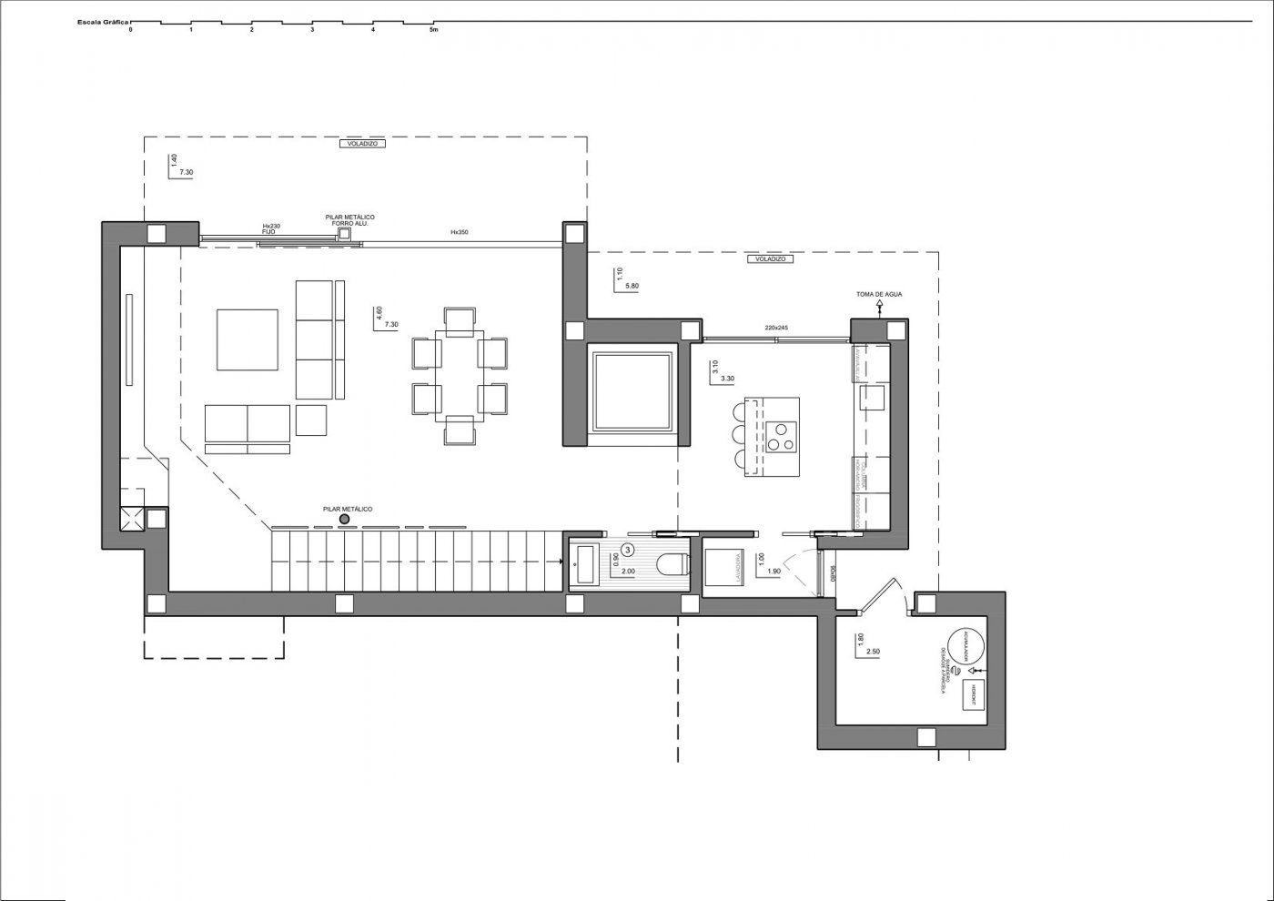 The ground floor, a large living area full of light, conected to the kitchen and the exterior, which makes this room the heart of the house.