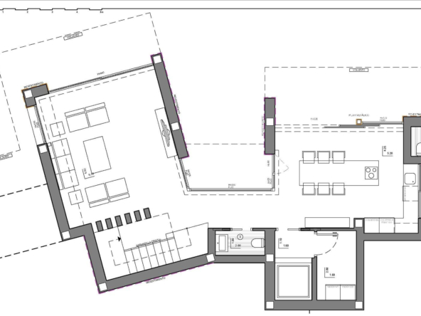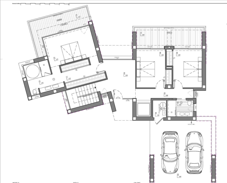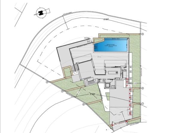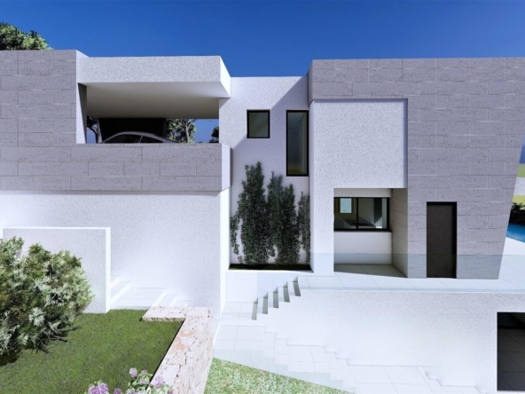 New Build modern villa design combines in an elegant and functional way, modern and Mediterranean architecture. On the façade, characterized by large geometrical shapes based on diagonal lines. The colour white dominates and the use of natural stone allows it to blend in with its environment.