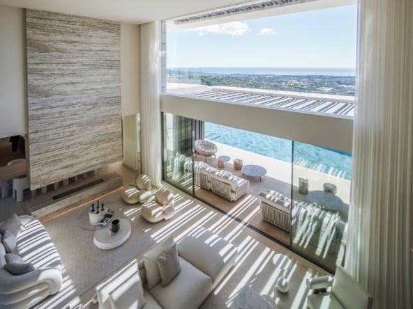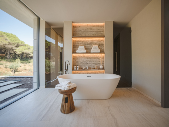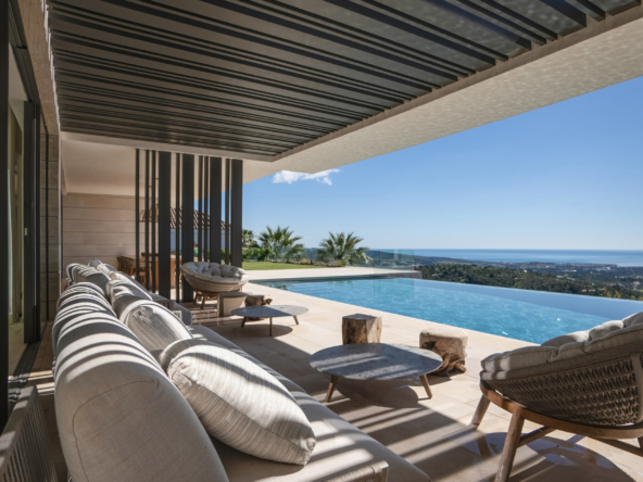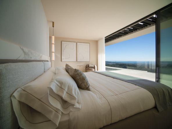 The interior of the villa stands out for its modern and sophisticated design, with spacious and bright areas that open up to the most impressive views of Sotogrande. The villa features 5 bedrooms, all oriented toward the landscape. The main living room, study, TV room, and staff bedroom, along with a gym, cinema, and wine cellar, provide a total comfort experience. The open-plan layout and high-end finishes, along with marble and wood elements, add warmth and elegance to every corner.