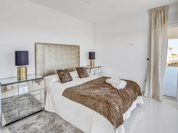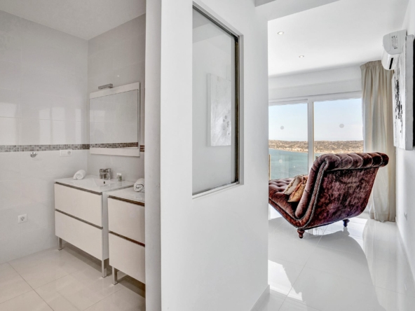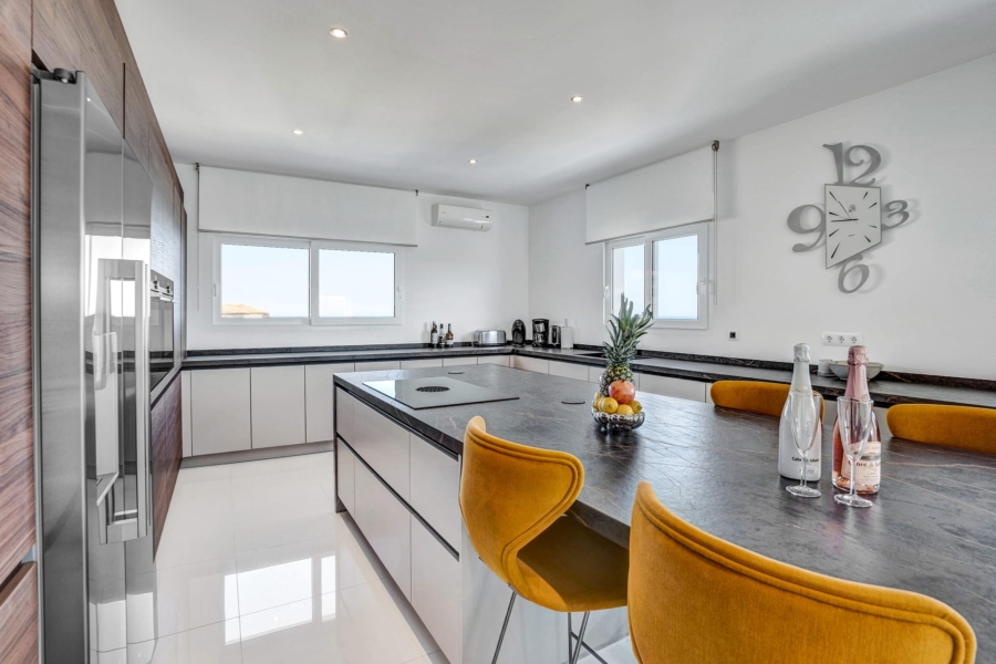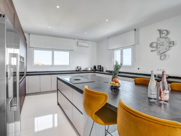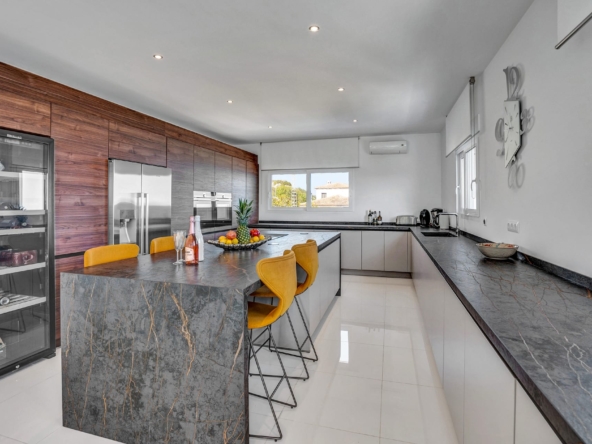 This residence features five luxurious bedroom suites, including a stunning primary suite, all with uninterrupted Mediterranean views. The expansive open-plan living area offers multiple stylish seating zones, including a TV lounge, a chill-out area, and a panoramic seating space that opens onto the main terrace. A sleek, fully equipped American-style kitchen complements the elegant dining area.