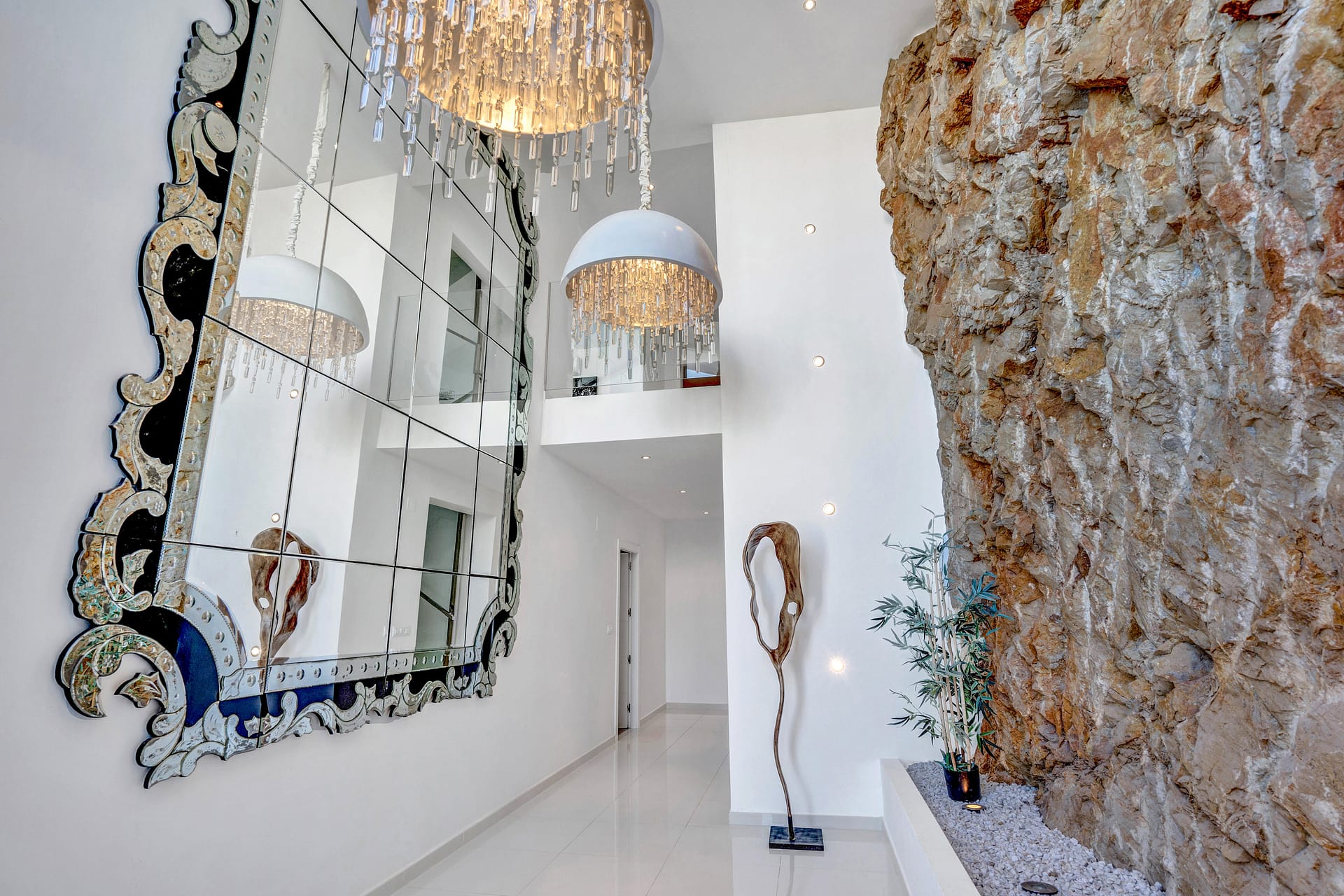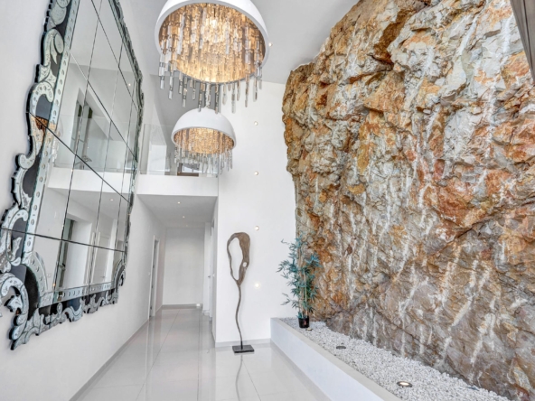 A four-person elevator ensures effortless access to all levels, while a double garage and an automated car turntable provide convenience. The villa is uniquely designed to incorporate natural rock formations, creating a distinctive and elegant focal point.