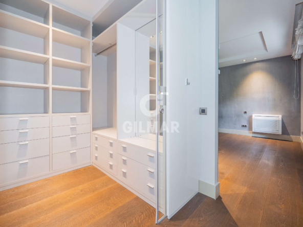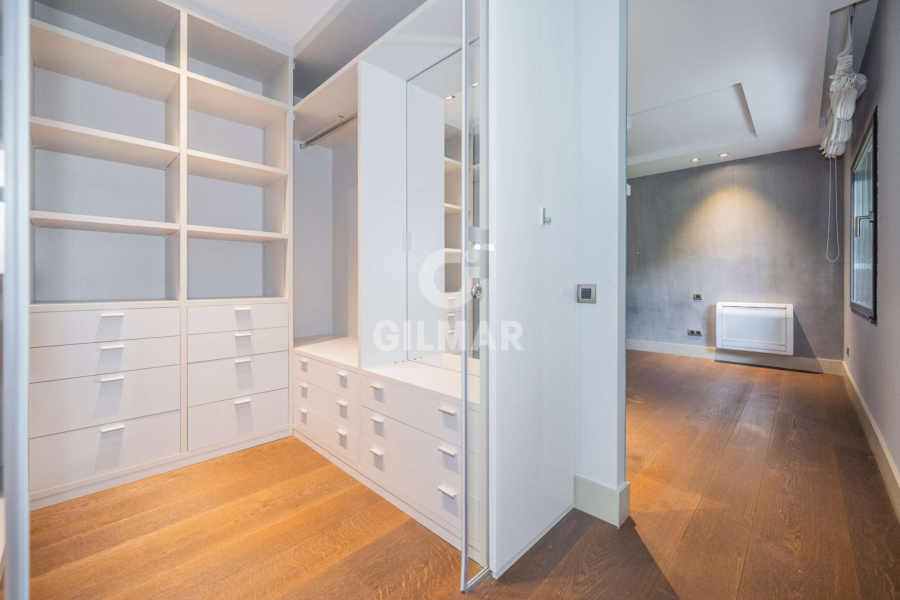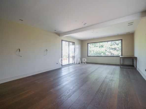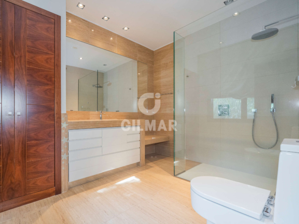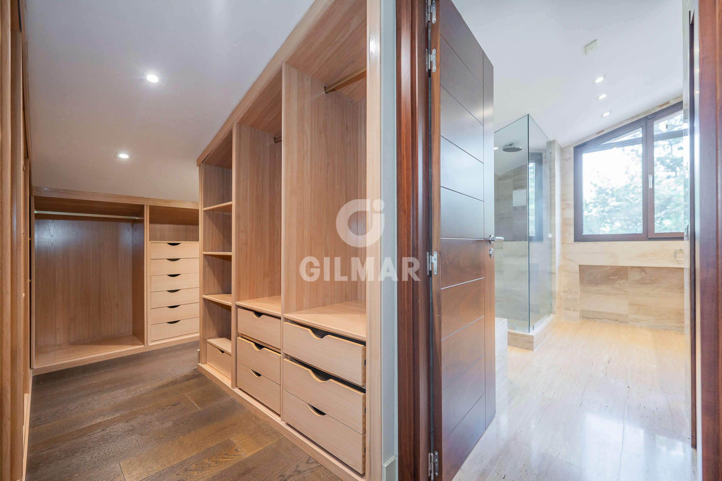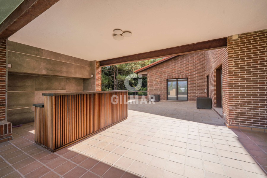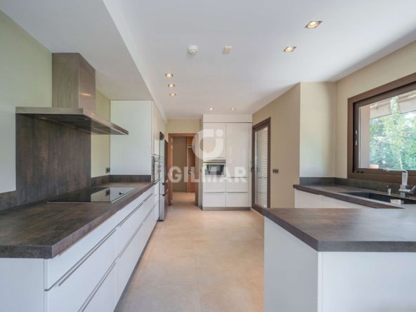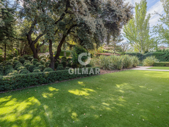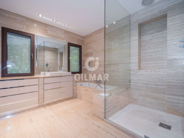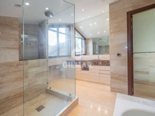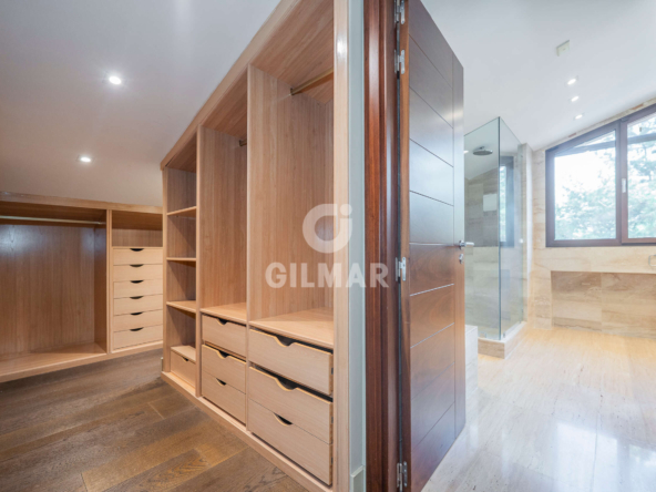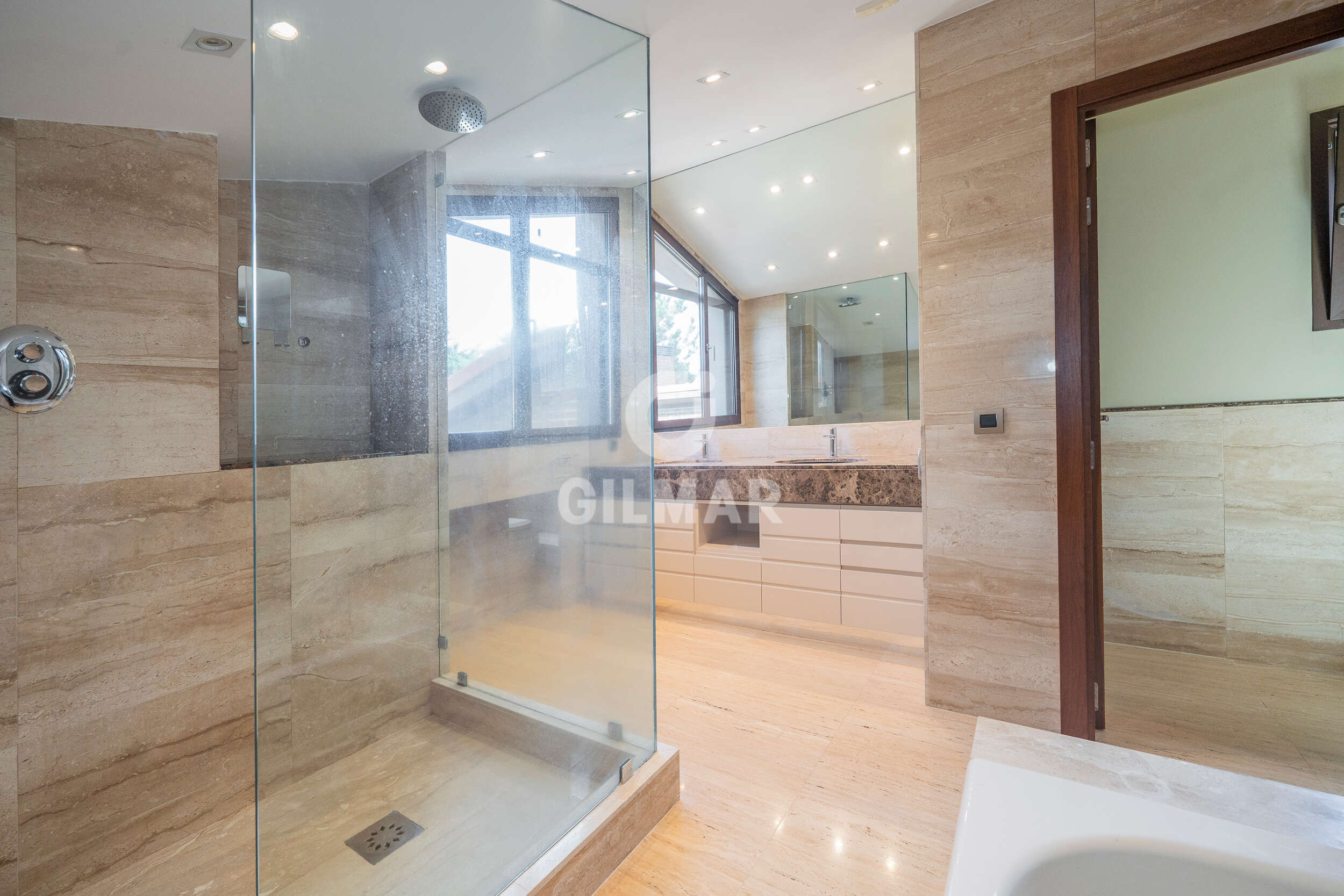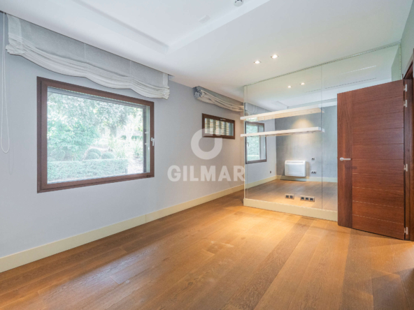 Access to the villa is through a beautiful entrance hall that leads to the spectacular English patio and the living room with fireplace. Also on this floor are the dining room, the impressive master suite with a dressing room, a bedroom, an office, and a bathroom. The first floor includes an en-suite bedroom with a dressing room and bathroom, an office, a guest toilet, a kitchen with a breakfast bar and access to a terrace, a bedroom, and a laundry area.