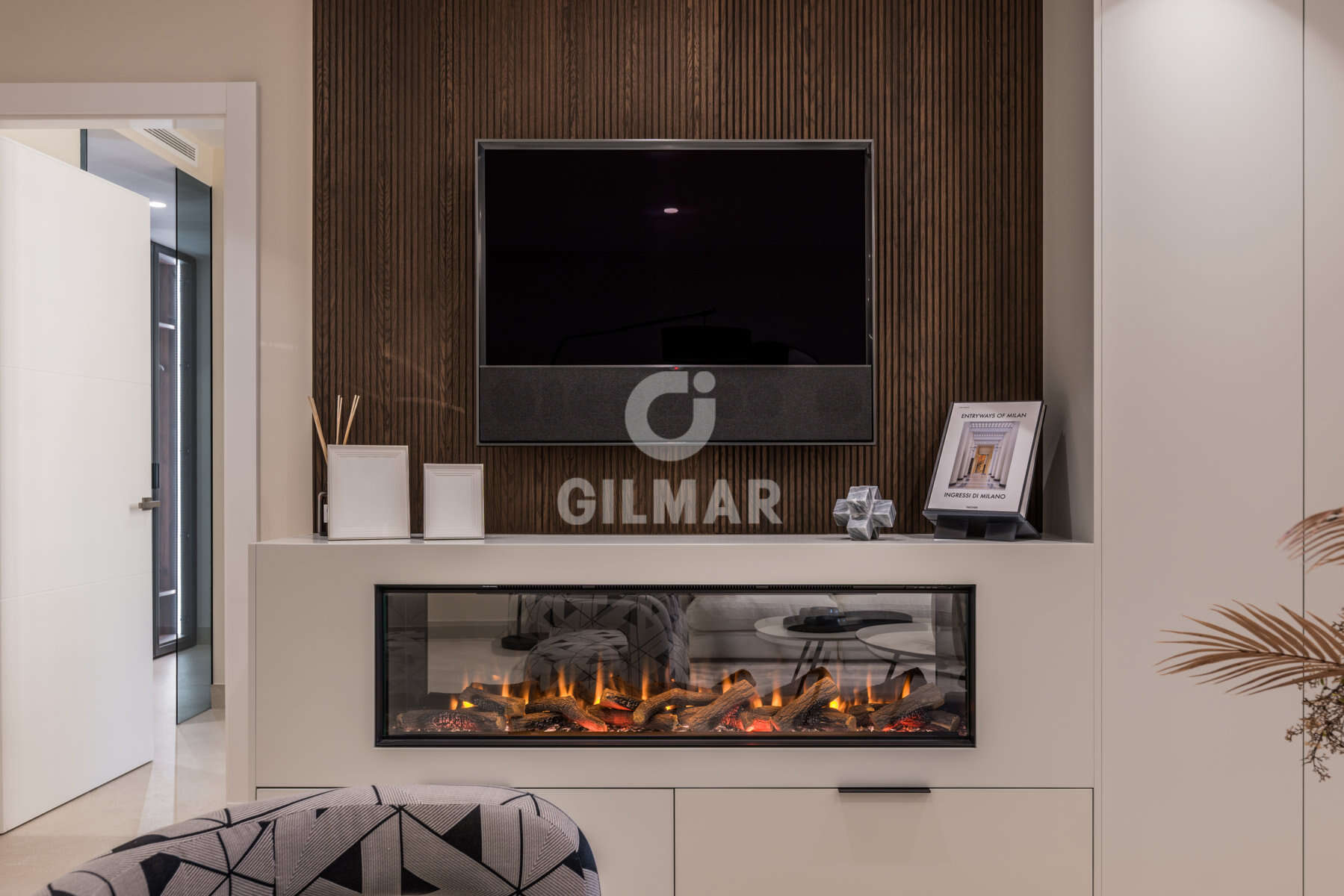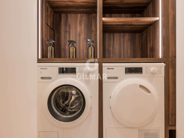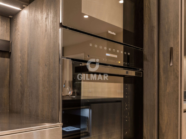 Upon entering the flat, you will be greeted by elegant floors and a brand new designer kitchen equipped with Miele appliances. In addition, a Bang & Olufsen sound system, bespoke wardrobes and an electric fireplace add a touch of luxury and sophistication. The property also includes a convenient underground parking space and a storage room.