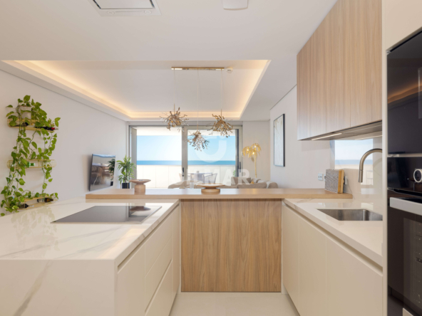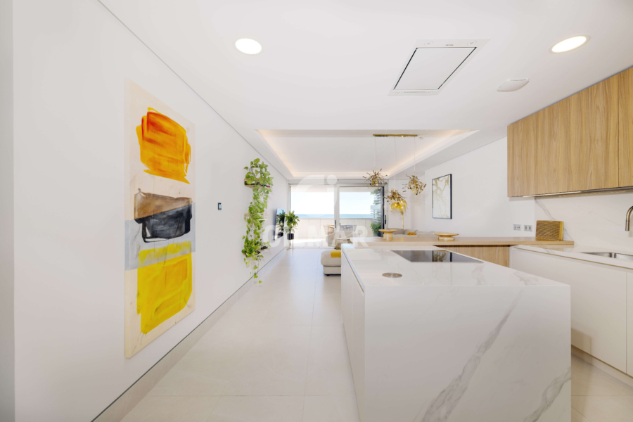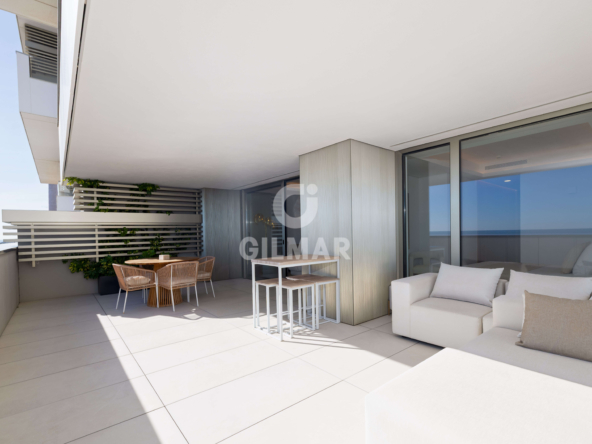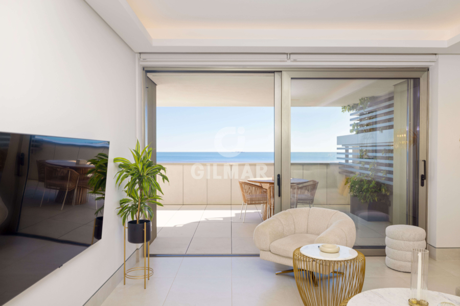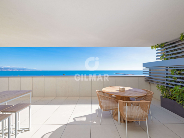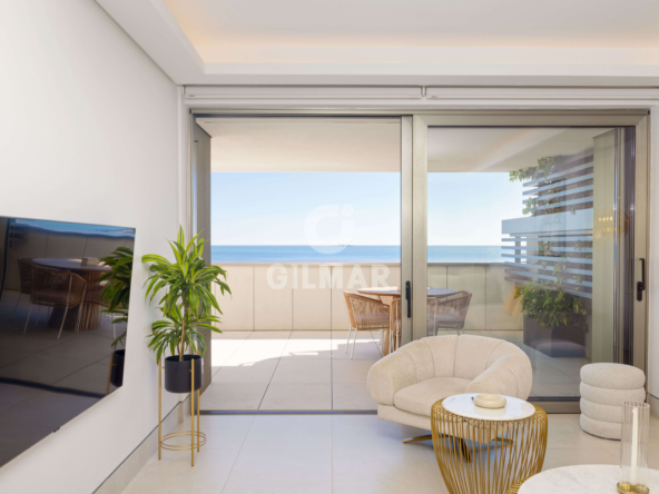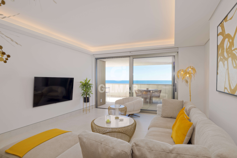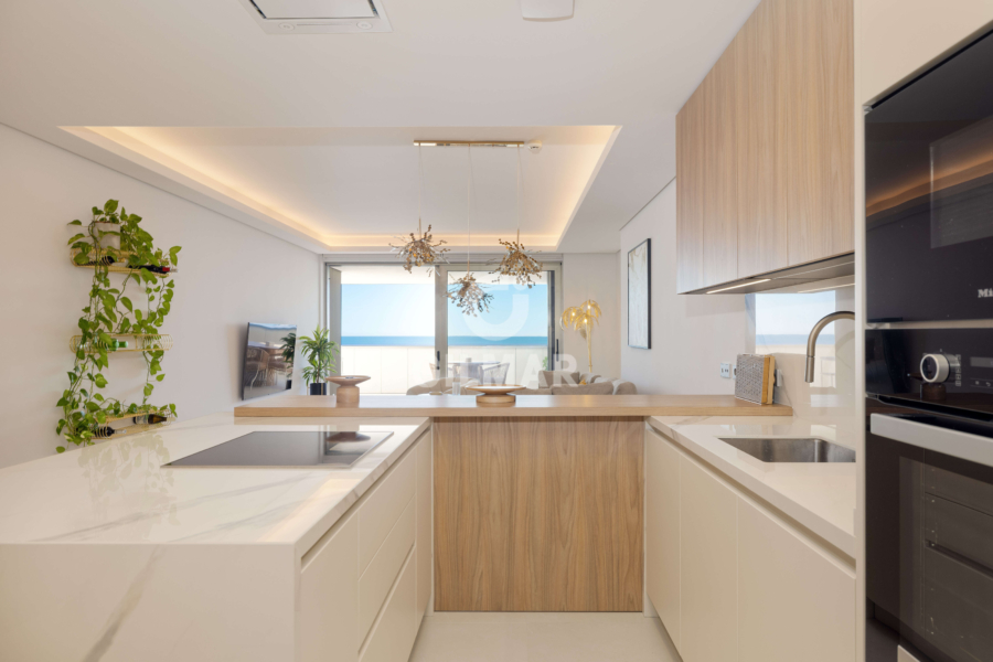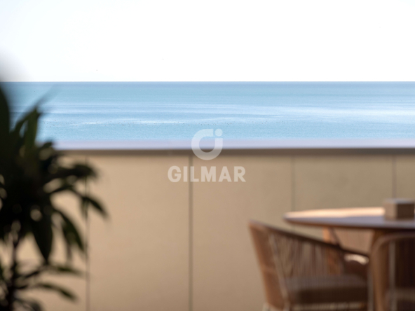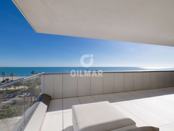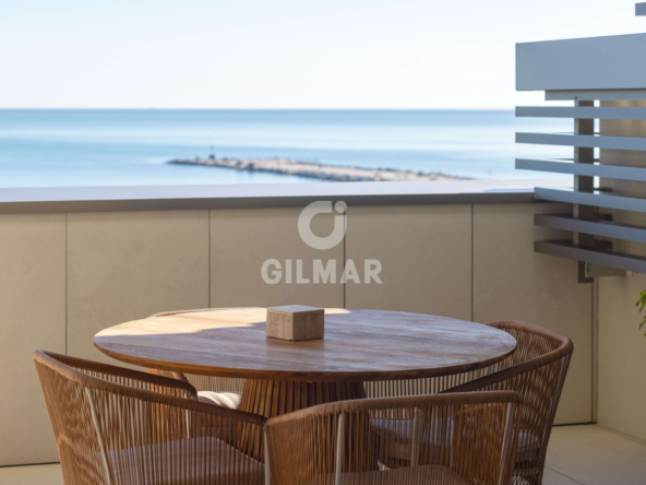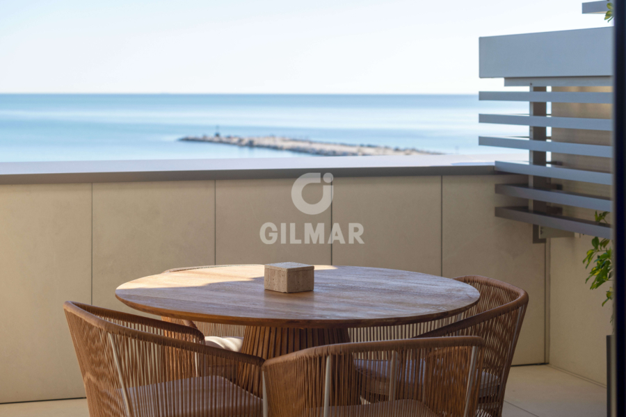 Located on the beachfront, this exclusive property boasts a total built area of 255 square meters, including common areas, garages, and storage rooms. It features a fantastic living room with two distinct areas for sitting and dining, all connected to a beautiful open-plan kitchen that offers a versatile space for everyday living. The living area opens onto a wonderful terrace, allowing you to enjoy panoramic views of the Mediterranean Sea while sharing pleasant moments with family and friends. There are two spacious double bedrooms; the master bedroom has an en-suite bathroom and, like the living room, connects to the terrace. A second bathroom serves as a guest bathroom for the second bedroom.