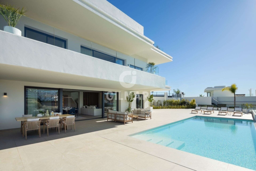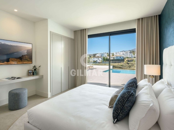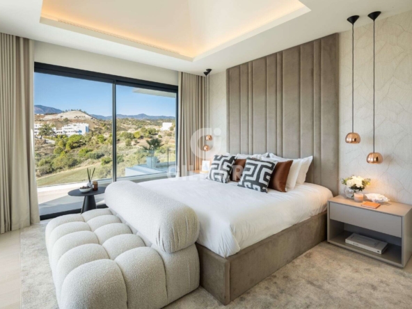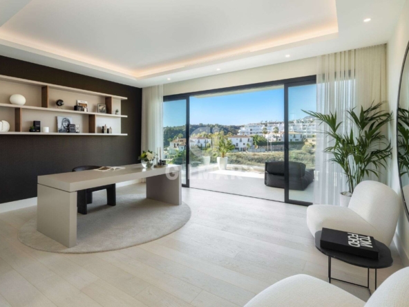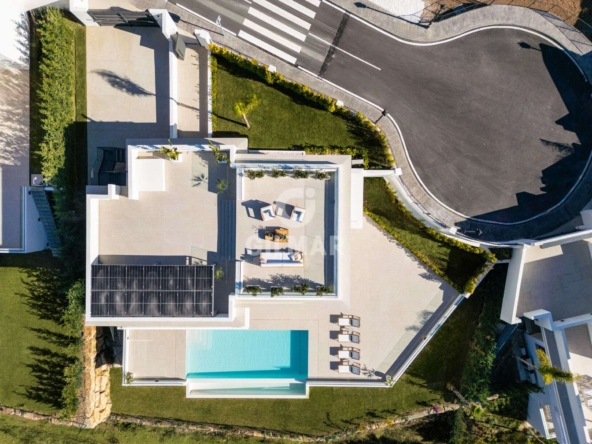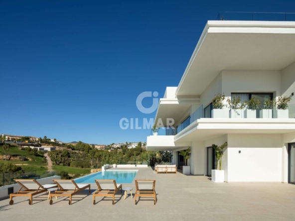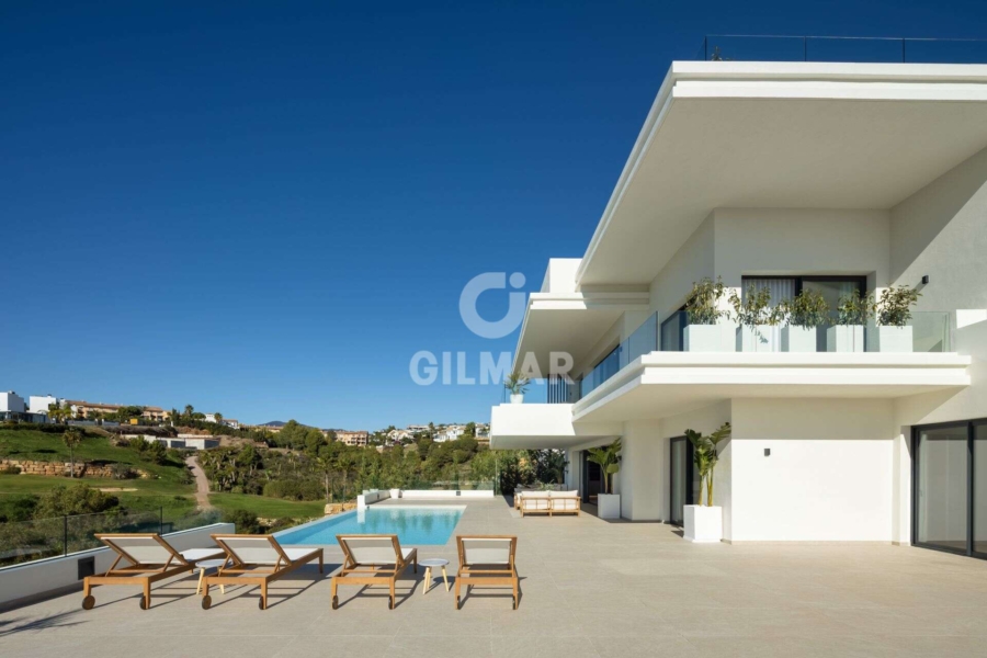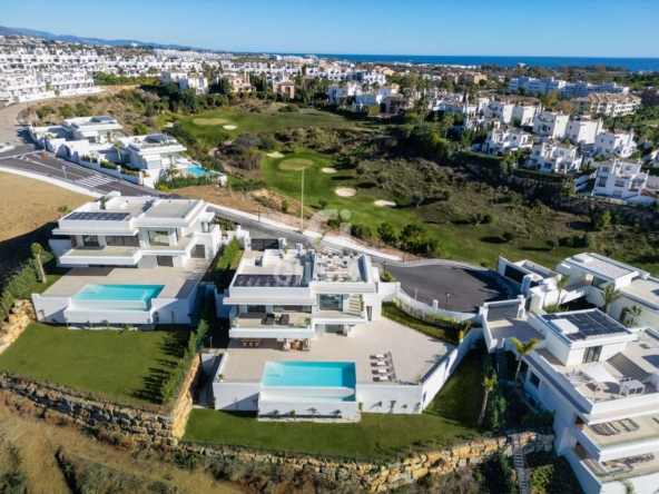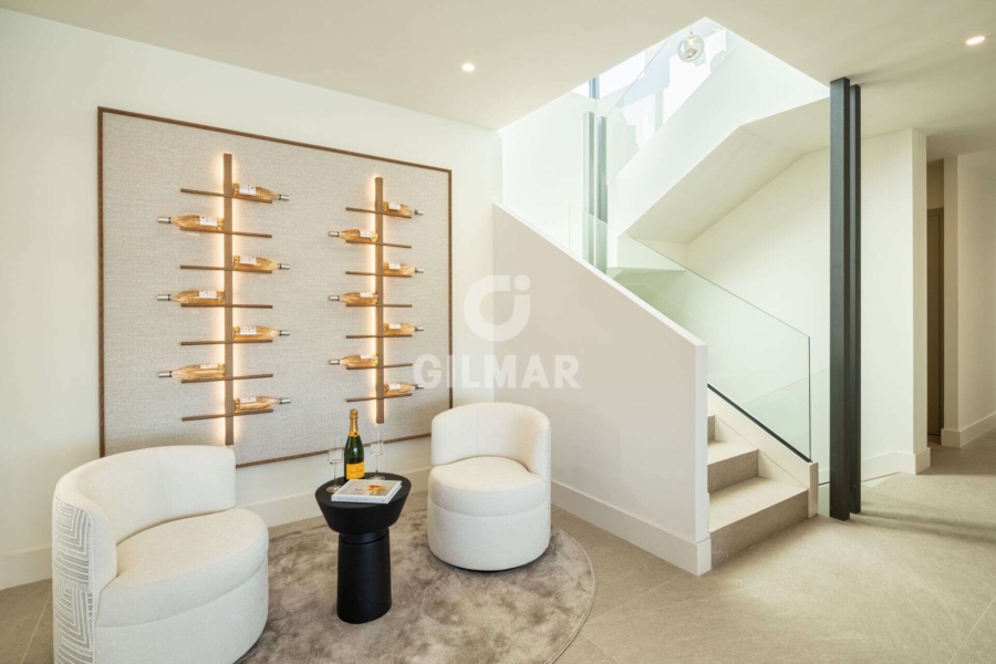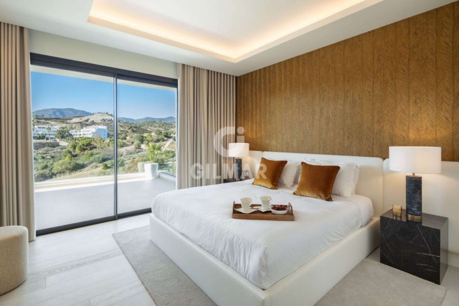 Spectacular villa in La Resina Golf, on the New Golden Mile. This exclusive project has six modern villas of new construction, each located on an elevated plot to enjoy optimal views and privacy. This villa is distributed in floors and five bedrooms. Upon entering, we are greeted by a versatile living room that serves as a cozy space. The master bedroom, on the left, overlooks the sea and has a bright en-suite bathroom and a large dressing room. The choice of fabrics and materials throughout the villa adds a layer of warmth and luxury to its modern design. To the right, a second en-suite bedroom is located. A staircase, adorned with a chandelier as the centerpiece of art, leads to the heart of the house. Here, the main living area merges with a kitchen equipped with Siemens appliances and a dining area accented by an elegant wine display wall. This level opens onto an expansive terrace with infinity pool, barbecue and sitting area, along with three additional bedrooms. It also features a rooftop terrace with pre-installations for Jacuzzi and barbecue, offering a perfect retreat for relaxation and entertaining. In addition, a raw basement presents a blank canvas for the new owner to customize their dream space.