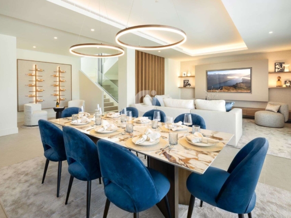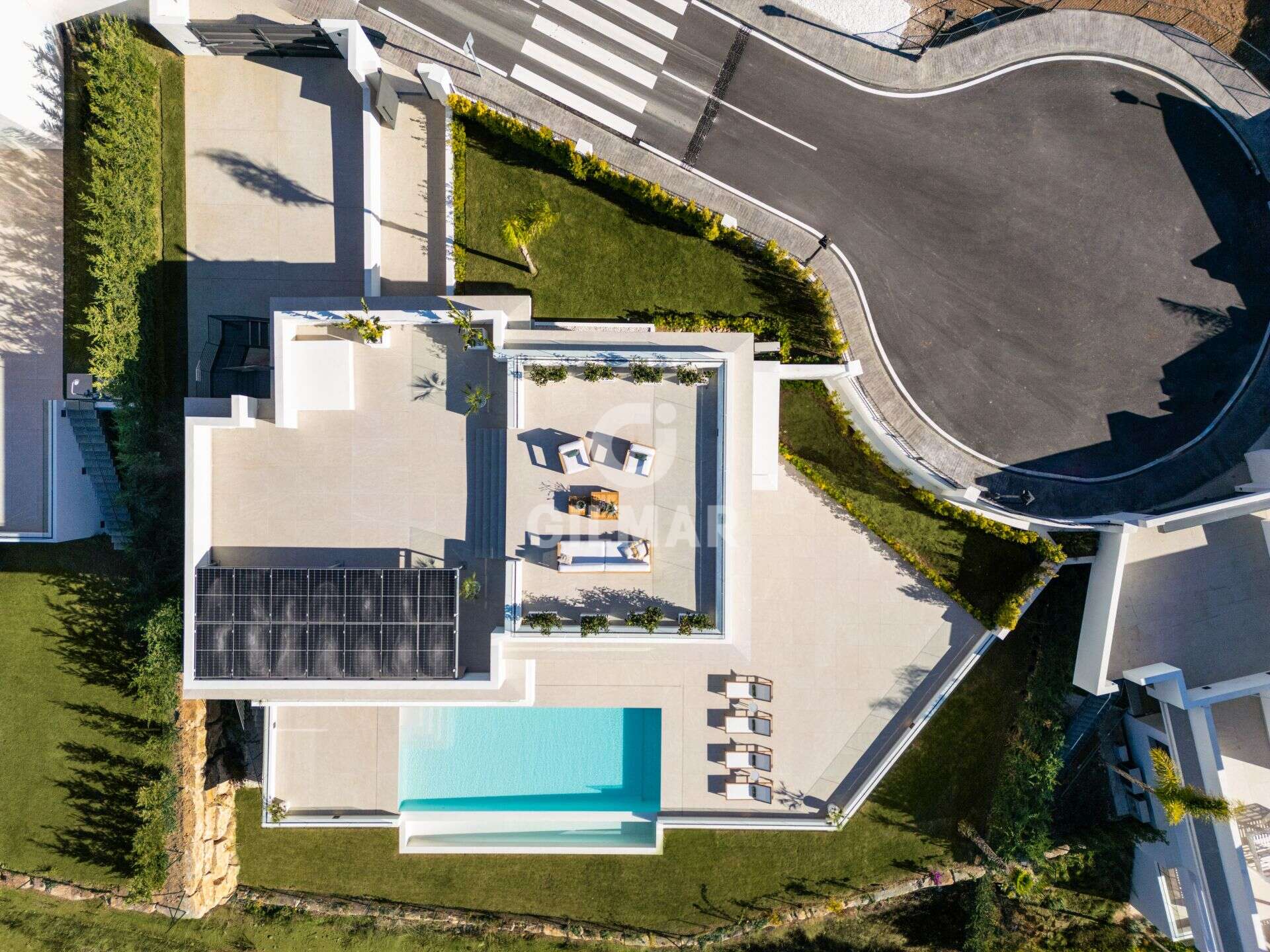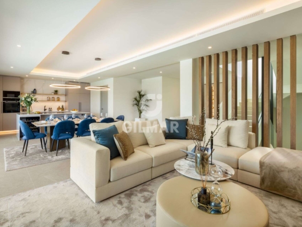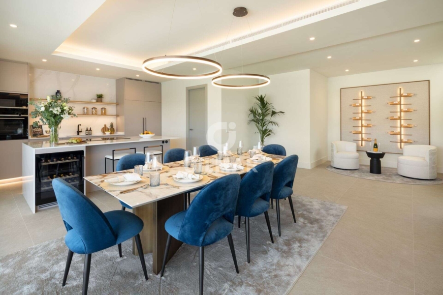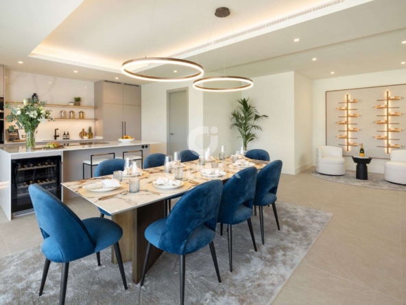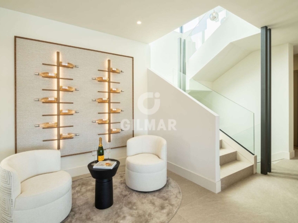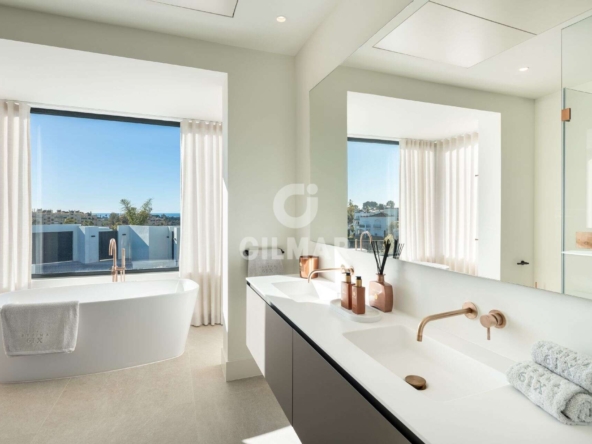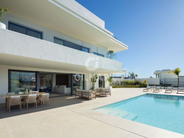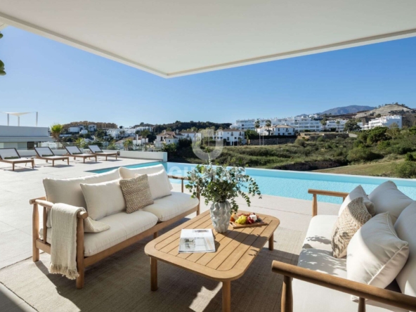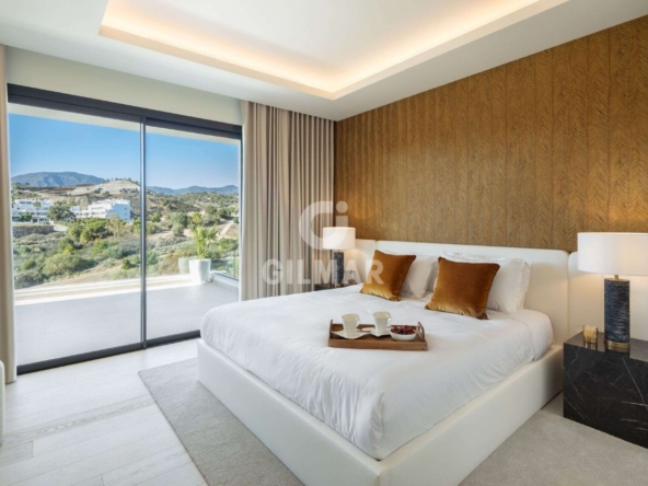Spectacular villa in La Resina Golf, on the New Golden Mile. This exclusive project has six modern villas of new construction, each located on an elevated plot to enjoy optimal views and privacy. This villa is distributed in floors and five bedrooms. Upon entering, we are greeted by a versatile living room that serves as a cozy space. The master bedroom, on the left, overlooks the sea and has a bright en-suite bathroom and a large dressing room. The choice of fabrics and materials throughout the villa adds a layer of warmth and luxury to its modern design. To the right, a second en-suite bedroom is located. A staircase, adorned with a chandelier as the centerpiece of art, leads to the heart of the house. Here, the main living area merges with a kitchen equipped with Siemens appliances and a dining area accented by an elegant wine display wall. This level opens onto an expansive terrace with infinity pool, barbecue and sitting area, along with three additional bedrooms. It also features a rooftop terrace with pre-installations for Jacuzzi and barbecue, offering a perfect retreat for relaxation and entertaining. In addition, a raw basement presents a blank canvas for the new owner to customize their dream space.
