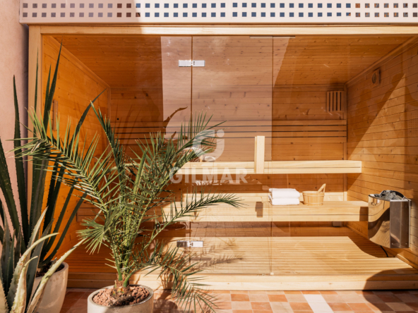 The property includes exclusive features such as a private pool, outdoor kitchen with dining and lounge area, and a sauna—offering the ultimate retreat for comfort and relaxation in the Costa del Sol.