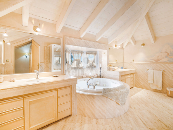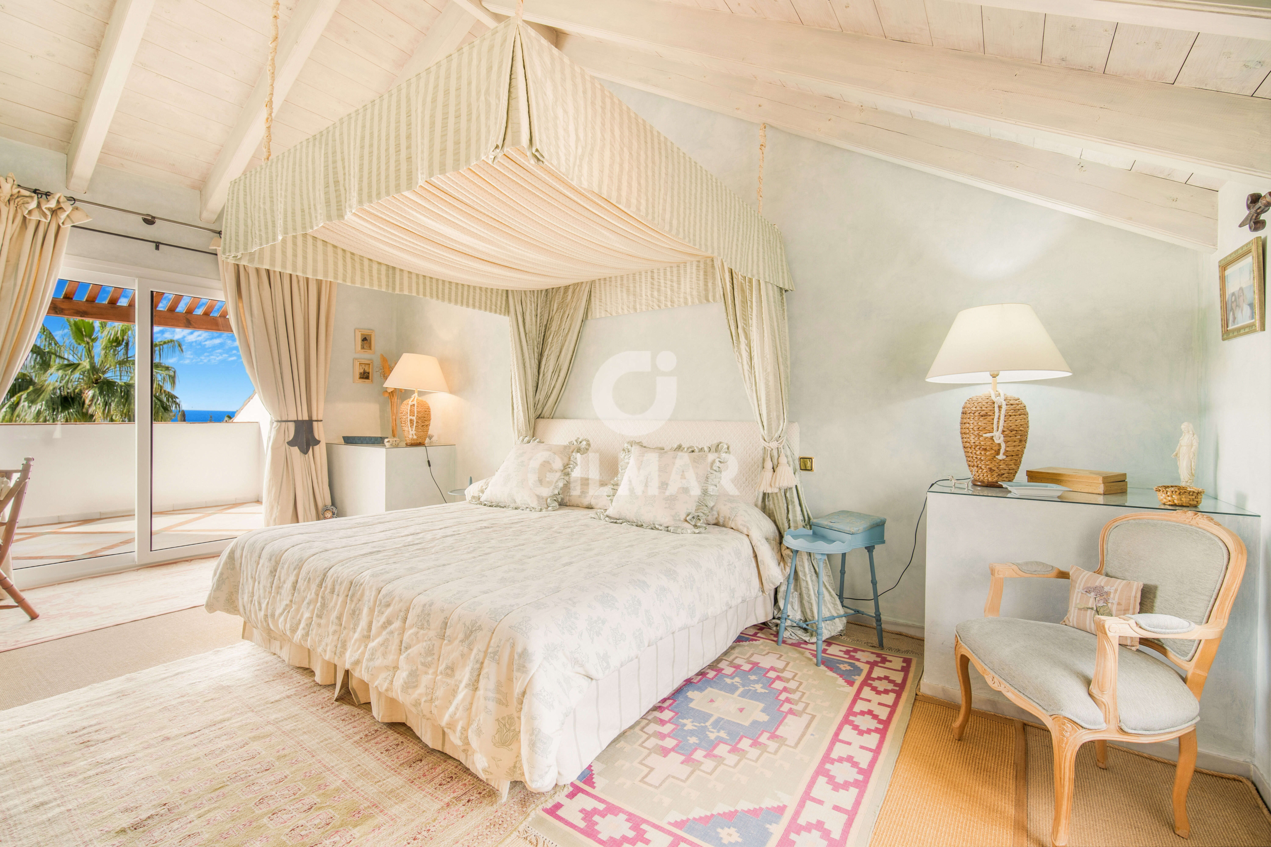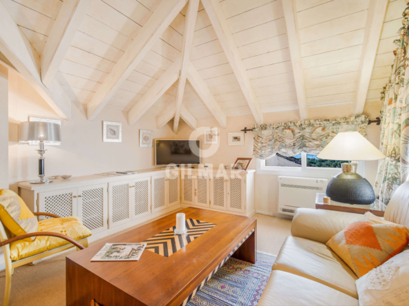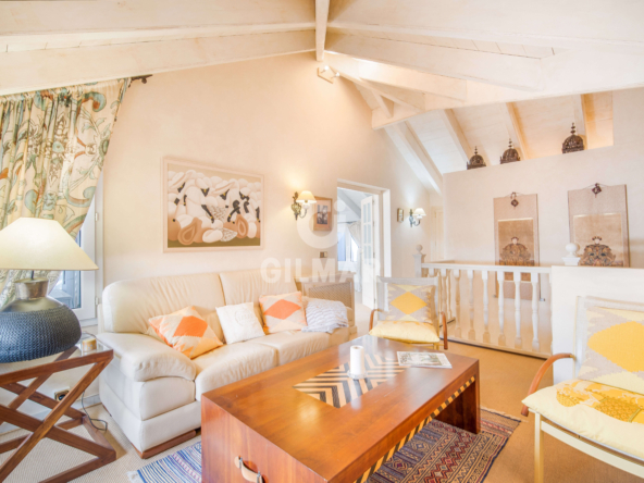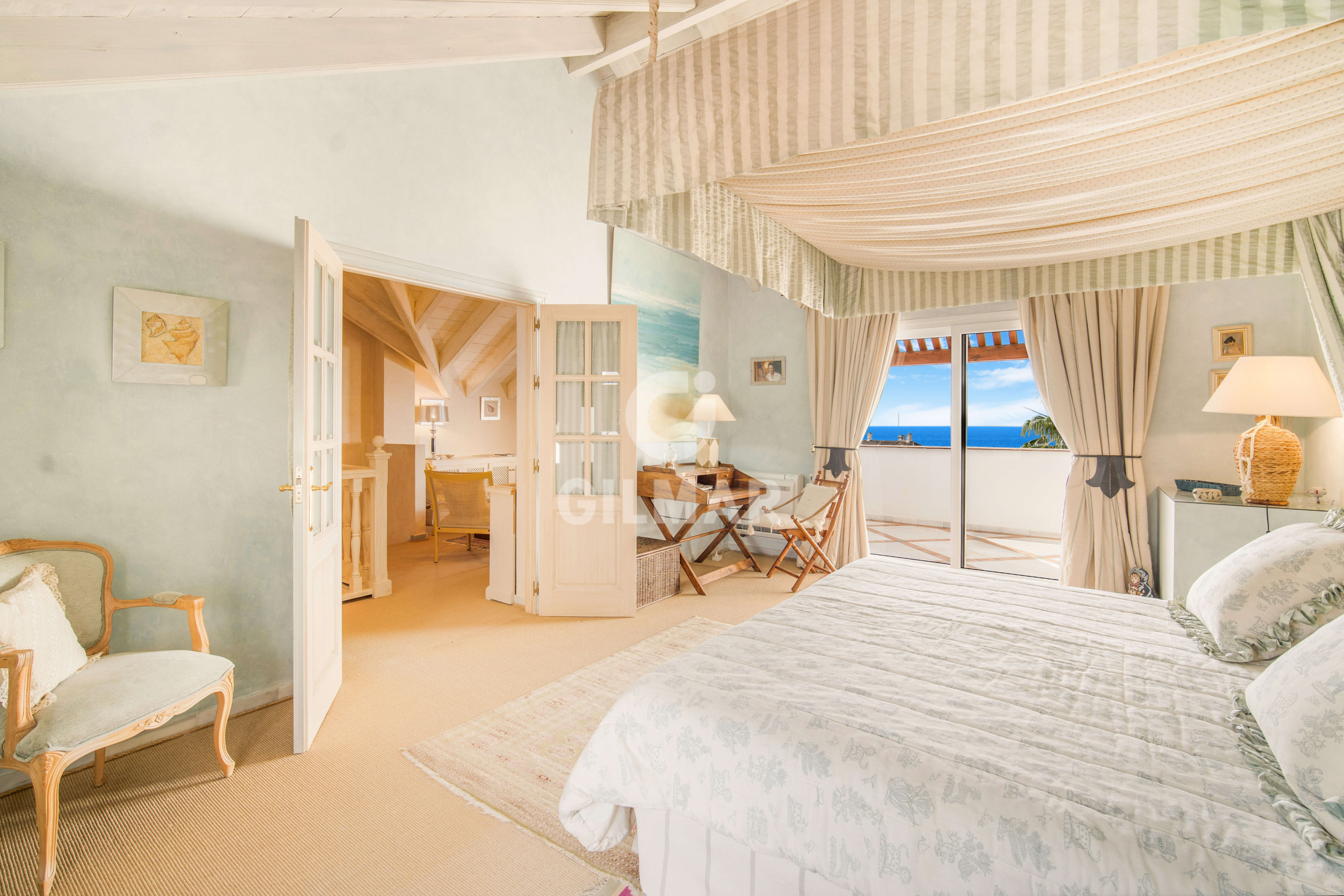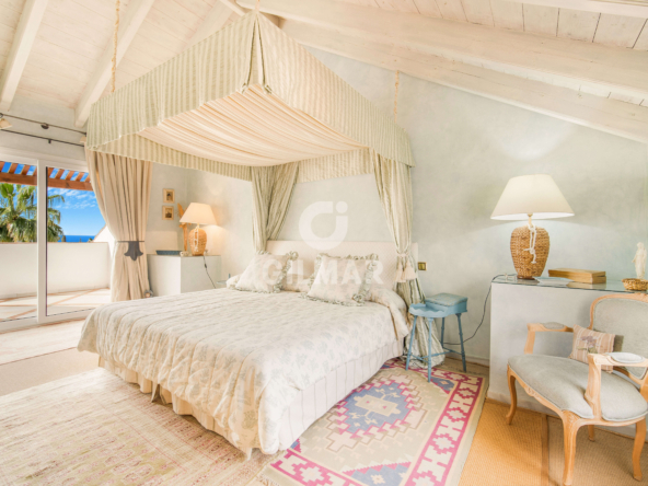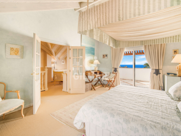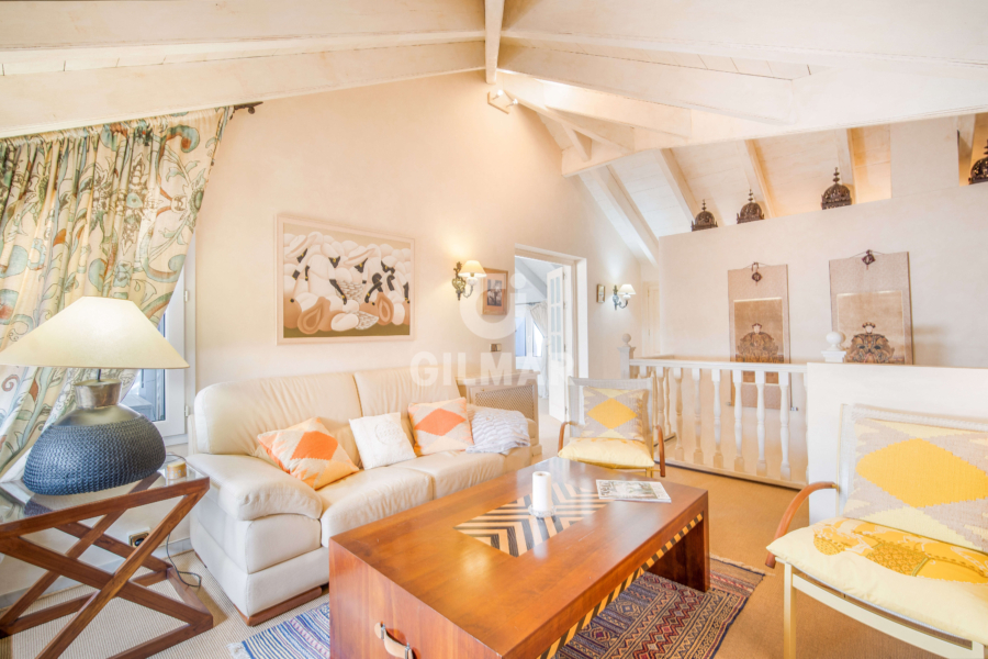 On the same floor there are two guest suites and a guest bathroom. On the upper level is the master suite with vaulted ceilings, a bathroom with jacuzzi and an area that is currently used as a lounge, but could also be used as a dressing room; there is also access from the bedroom to a private terrace with incredible sea views.