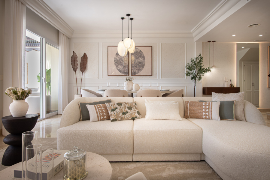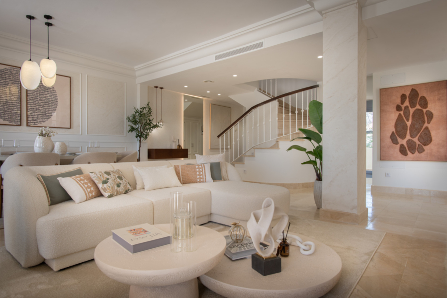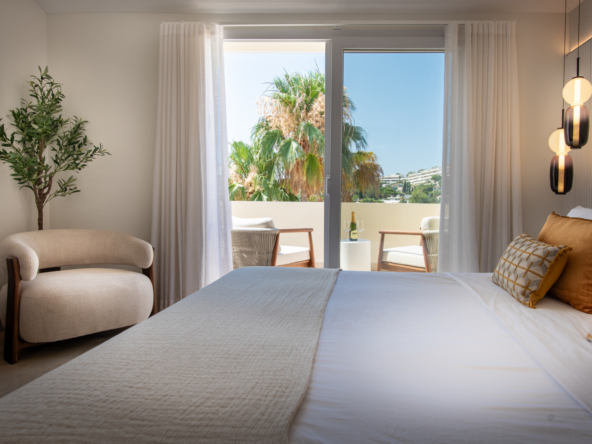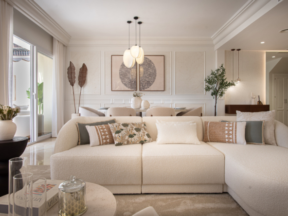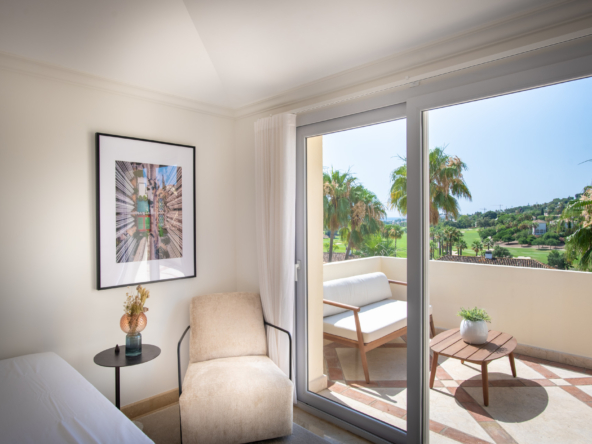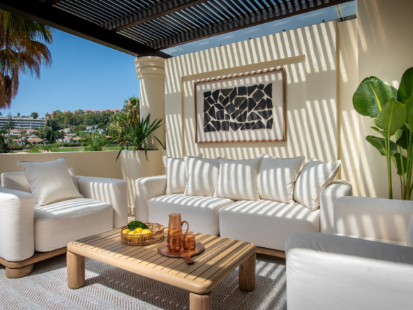 Spread across two levels, this sophisticated penthouse offers spacious interiors and expansive terraces that perfectly capture the essence of the Marbella lifestyle. The bright living and dining area opens directly onto generous outdoor spaces, ideal for al-fresco dining, entertaining, or simply relaxing while enjoying the spectacular golf course views. Its refined design, with carefully selected furnishings and warm tones, creates a welcoming yet luxurious atmosphere.