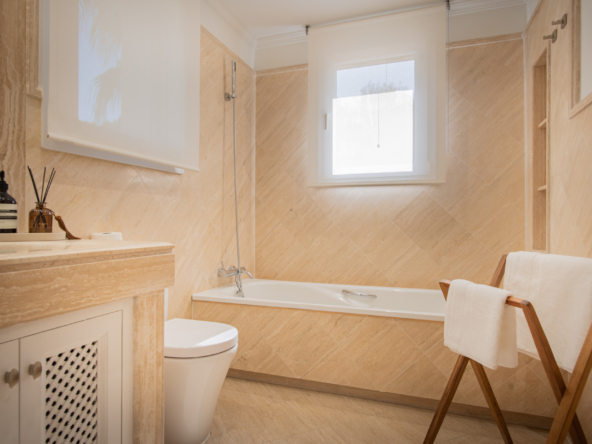 The penthouse interior showcases timeless elegance with a contemporary edge. High-quality materials, soft neutral tones, and natural light define every space, creating a perfect balance of sophistication and comfort. From every level, residents can enjoy open golf views and a seamless indoor-outdoor living experience. The modern Miele kitchen is fully equipped with premium appliances, while the three bedrooms are designed for comfort, featuring fitted wardrobes, ample space, and access to private terraces. The bathrooms are fitted with high-end Dormitech fixtures, combining functionality and elegant design.