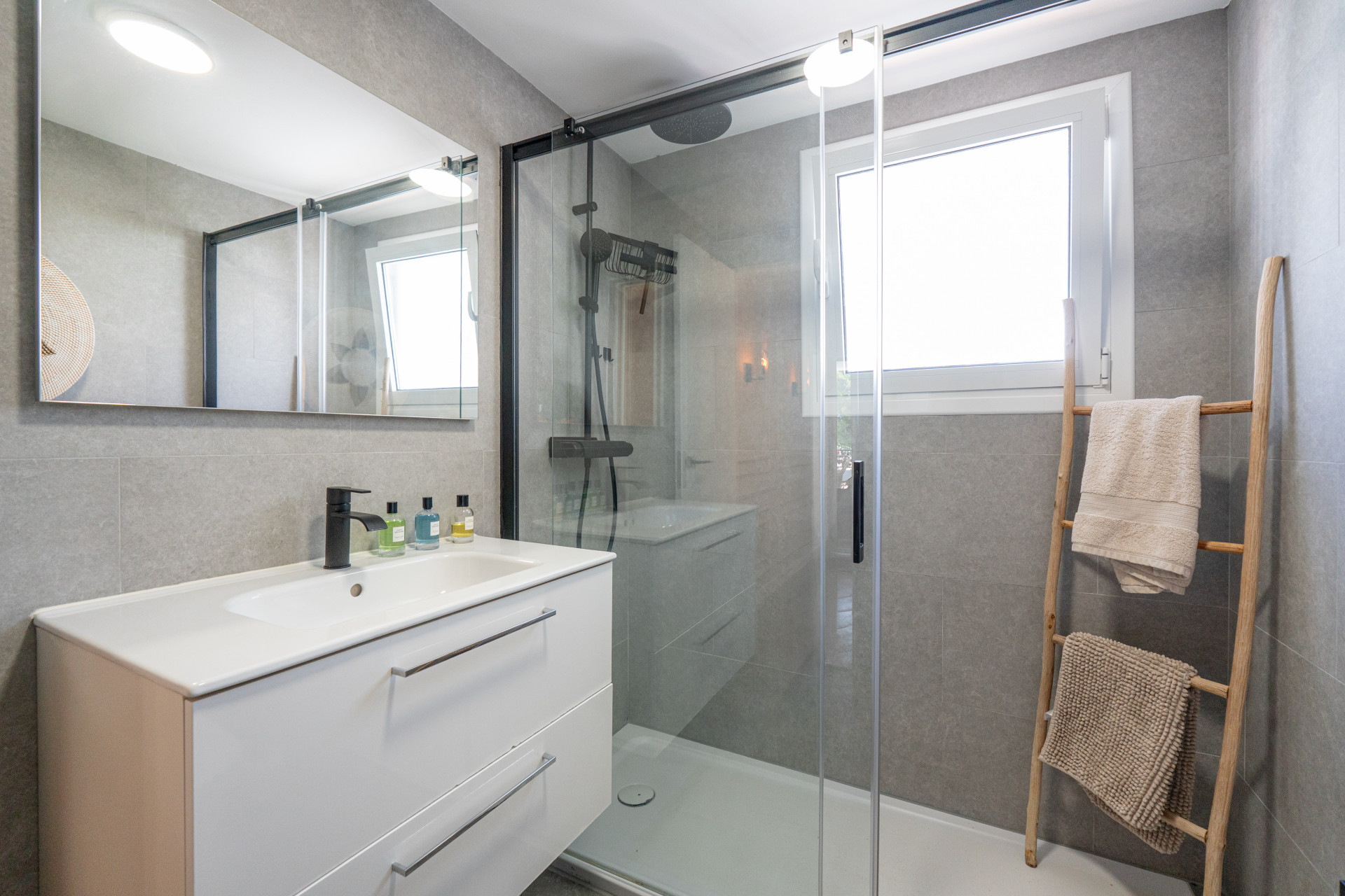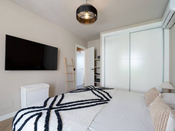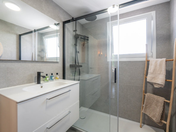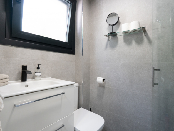 Upstairs, the home features two comfortable bedrooms. The south-facing master bedroom boasts open views of Mijas Golf, adding a unique sense of space and serenity. The sleek, modern bathroom includes a walk-in shower and high-end fixtures.