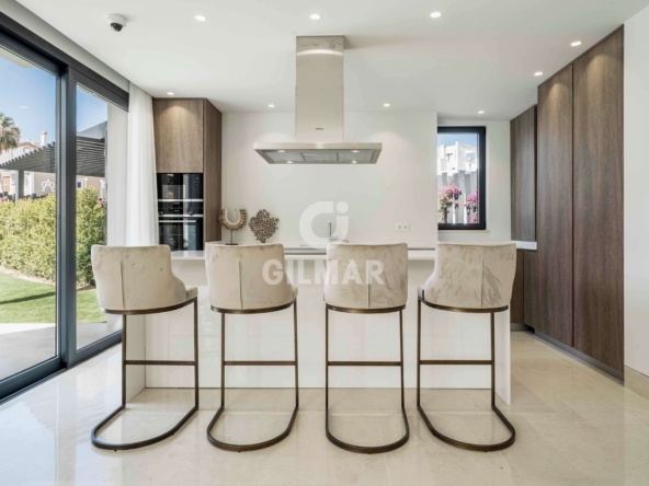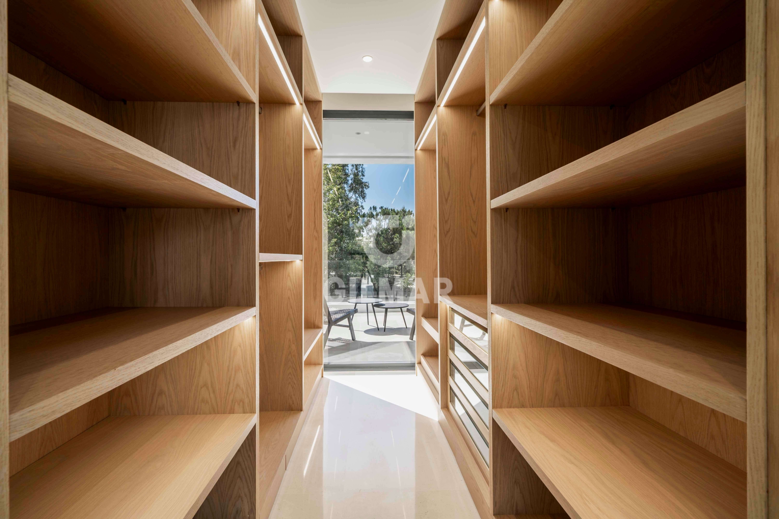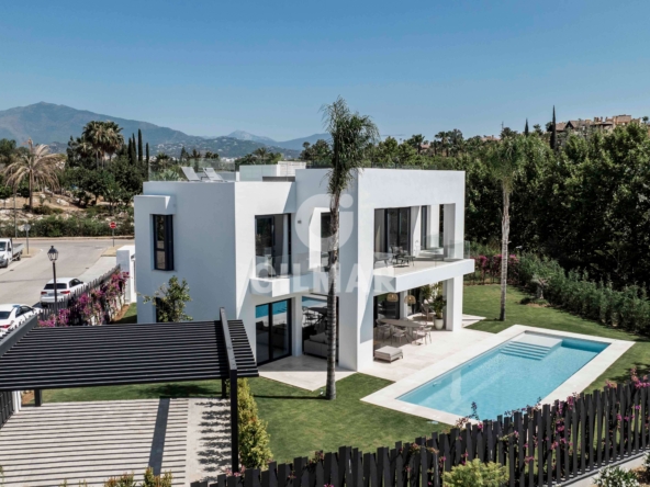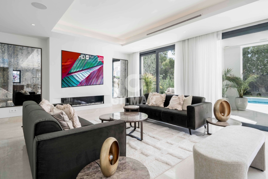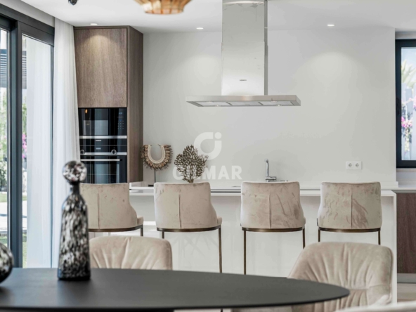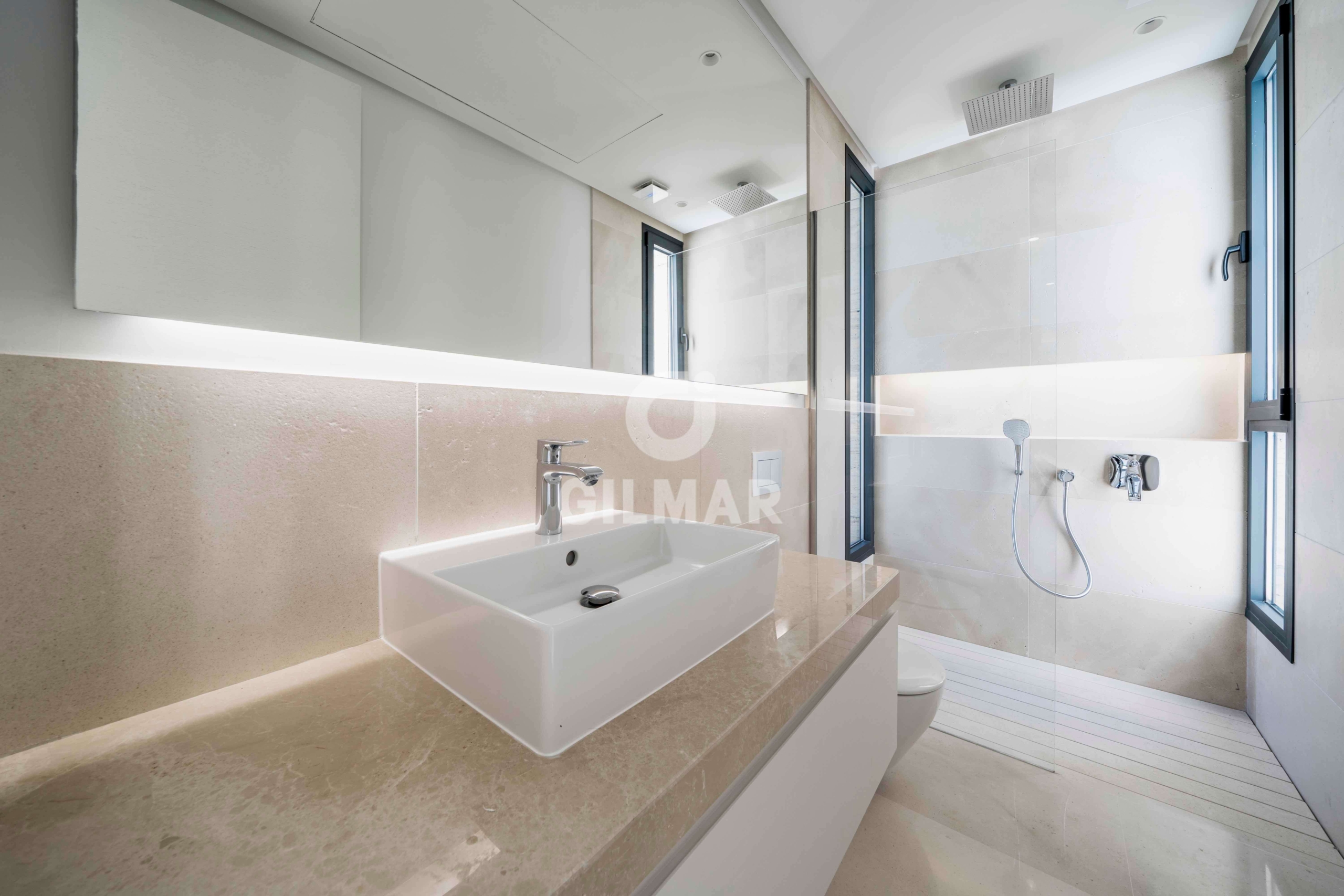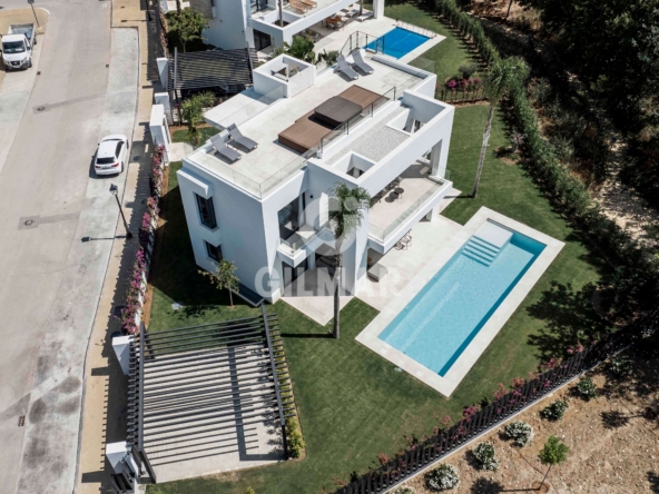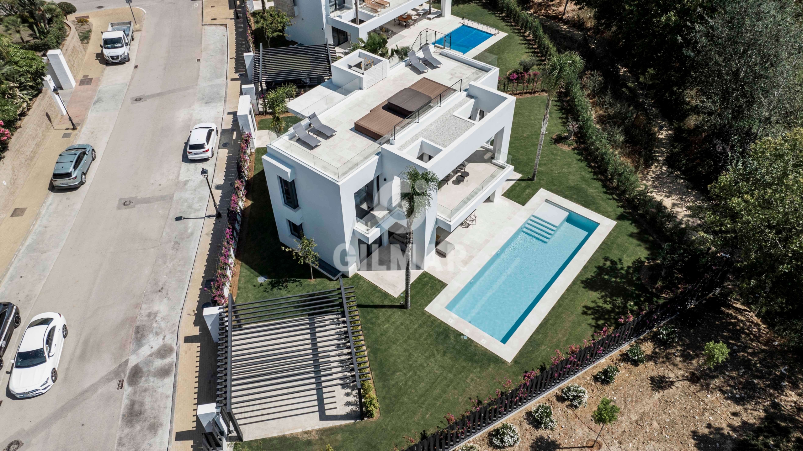 This exclusive property is built on four levels. The entrance to the villa you will find impressive high ceilings, with spacious windows that provide natural light. Further you will see the spacious open plan living space with fully equipped designer kitchen, dining area and cozy lounge with a fireplace and guest toilet. On the first floor, there are three bedrooms en suite, the master bedroom with dressing area, each bedroom with access to a private terrace. All bedrooms have been designed to provide ultimate comfort and relaxation. High-quality and luxurious furnishings, and home automation with a sound system. Offering the perfect combination of luxury and comfort. Lower floor we find one guest bedroom en suite, the laundry, and an entertainment area, the cinema and the bar. On the roof terrace-solarium has a stylish wooden jacuzzi area, with some mountain views, as well there is a spectacular space for sunbathing, entertaining, and al fresco dining. Underfloor heating on the ground and first floors, air conditioning, private pool and outside parking for 2 cars.