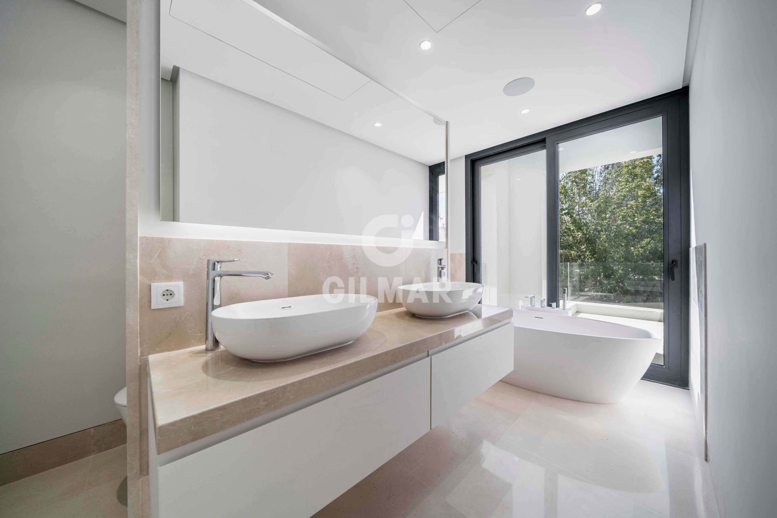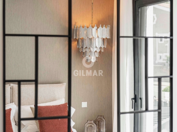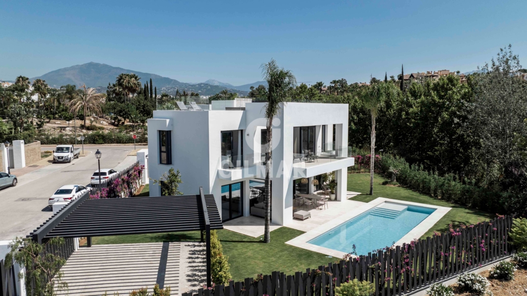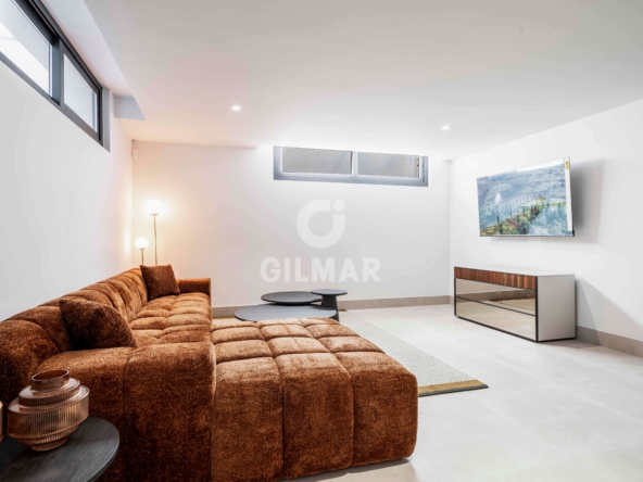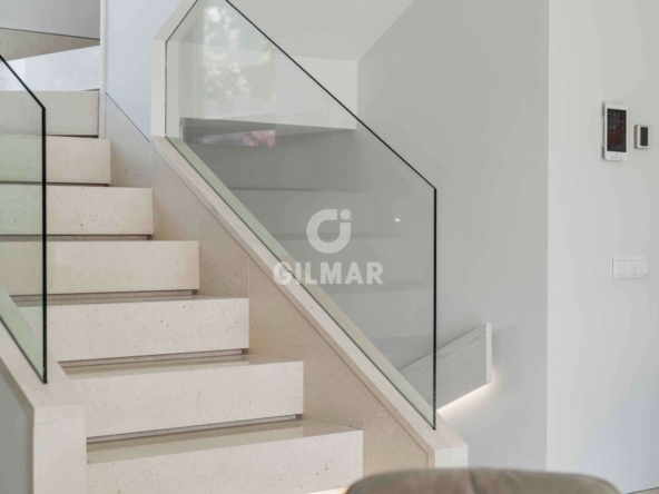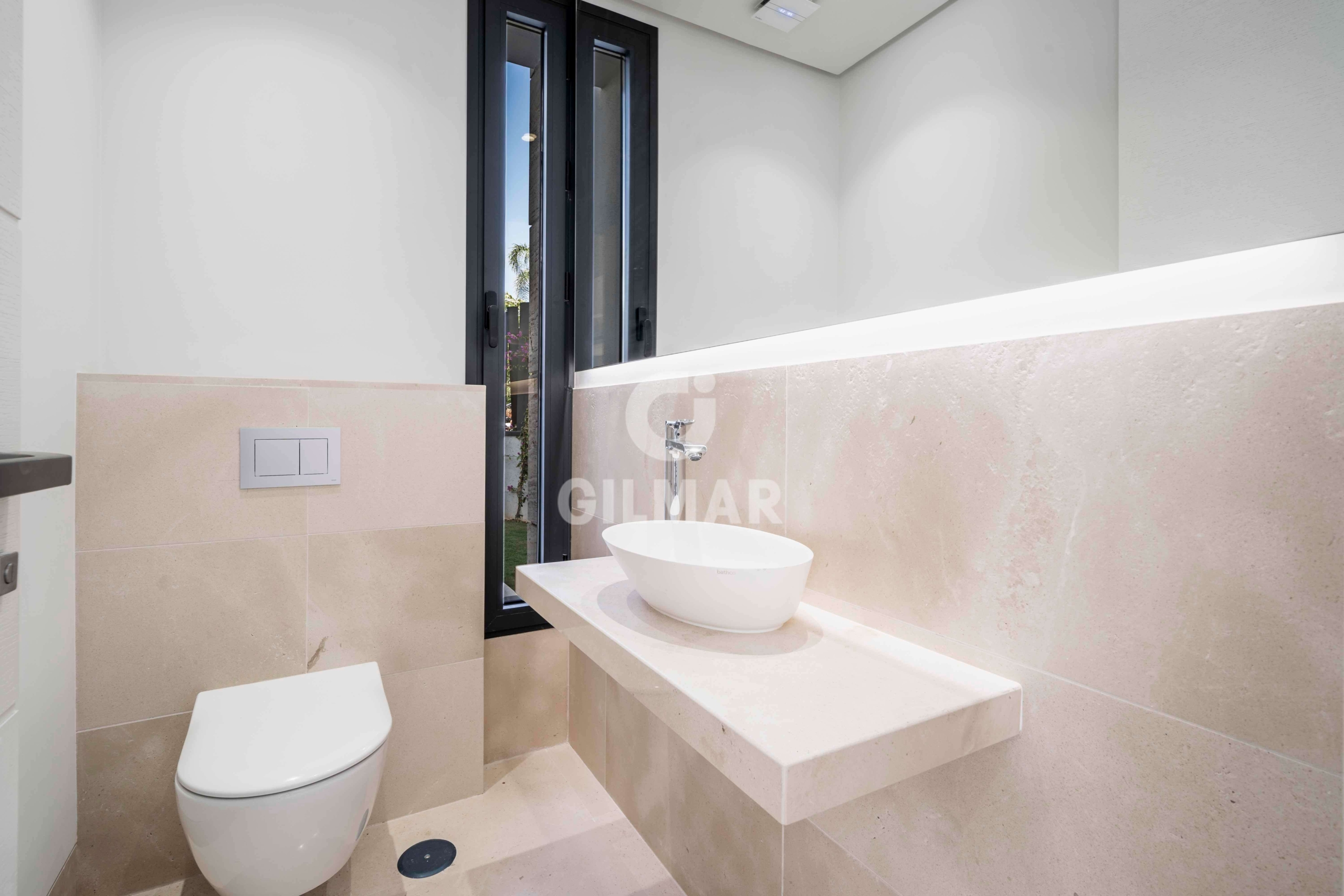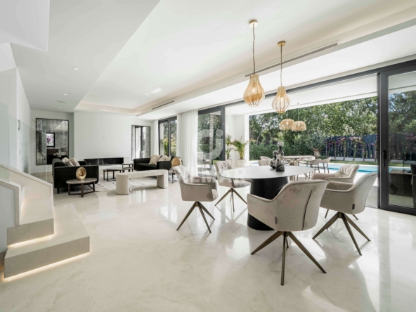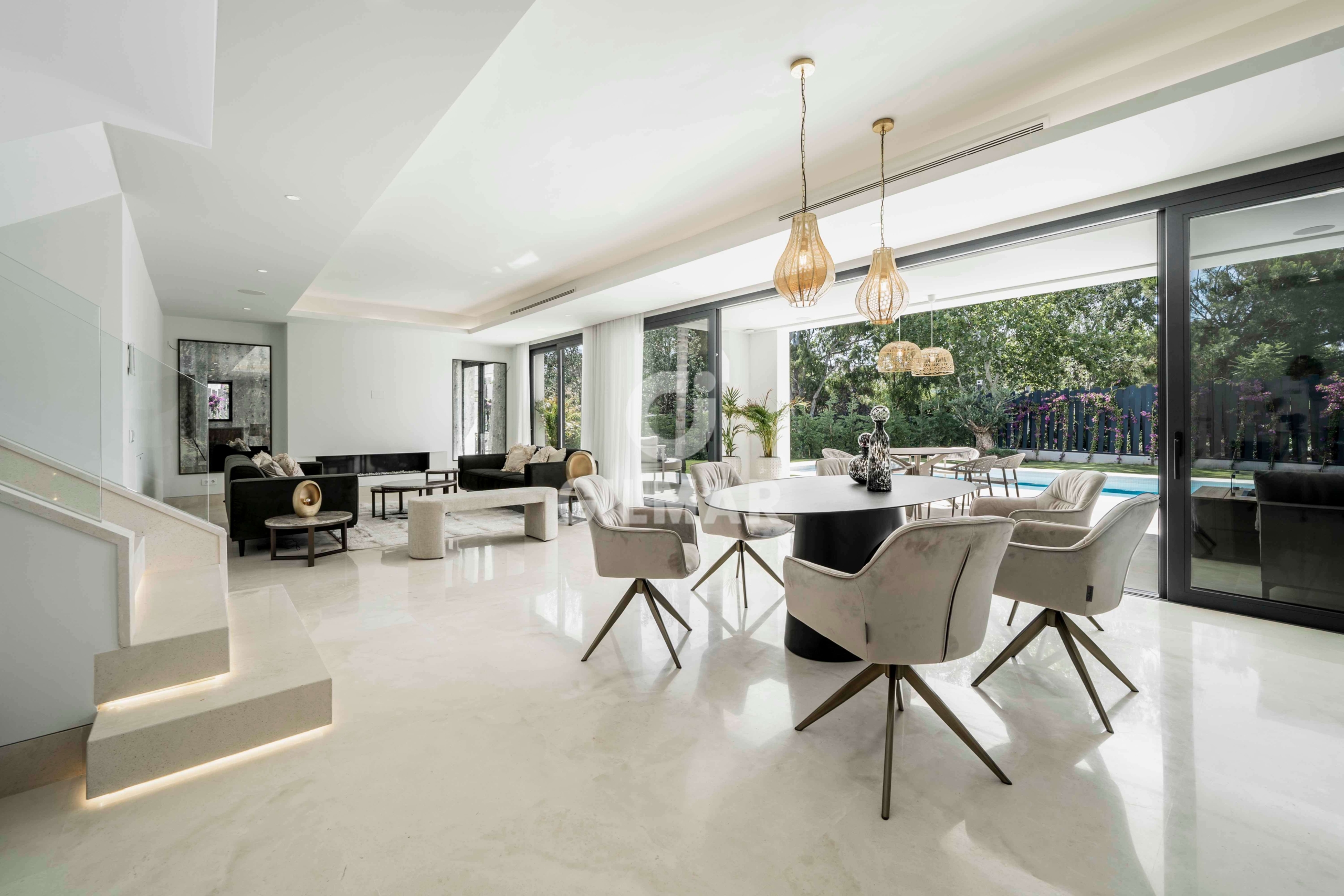This exclusive property is built on four levels. The entrance to the villa you will find impressive high ceilings, with spacious windows that provide natural light. Further you will see the spacious open plan living space with fully equipped designer kitchen, dining area and cozy lounge with a fireplace and guest toilet. On the first floor, there are three bedrooms en suite, the master bedroom with dressing area, each bedroom with access to a private terrace. All bedrooms have been designed to provide ultimate comfort and relaxation. High-quality and luxurious furnishings, and home automation with a sound system. Offering the perfect combination of luxury and comfort. Lower floor we find one guest bedroom en suite, the laundry, and an entertainment area, the cinema and the bar. On the roof terrace-solarium has a stylish wooden jacuzzi area, with some mountain views, as well there is a spectacular space for sunbathing, entertaining, and al fresco dining. Underfloor heating on the ground and first floors, air conditioning, private pool and outside parking for 2 cars.