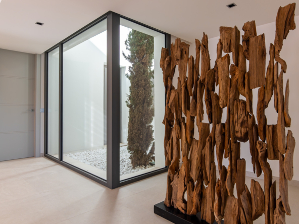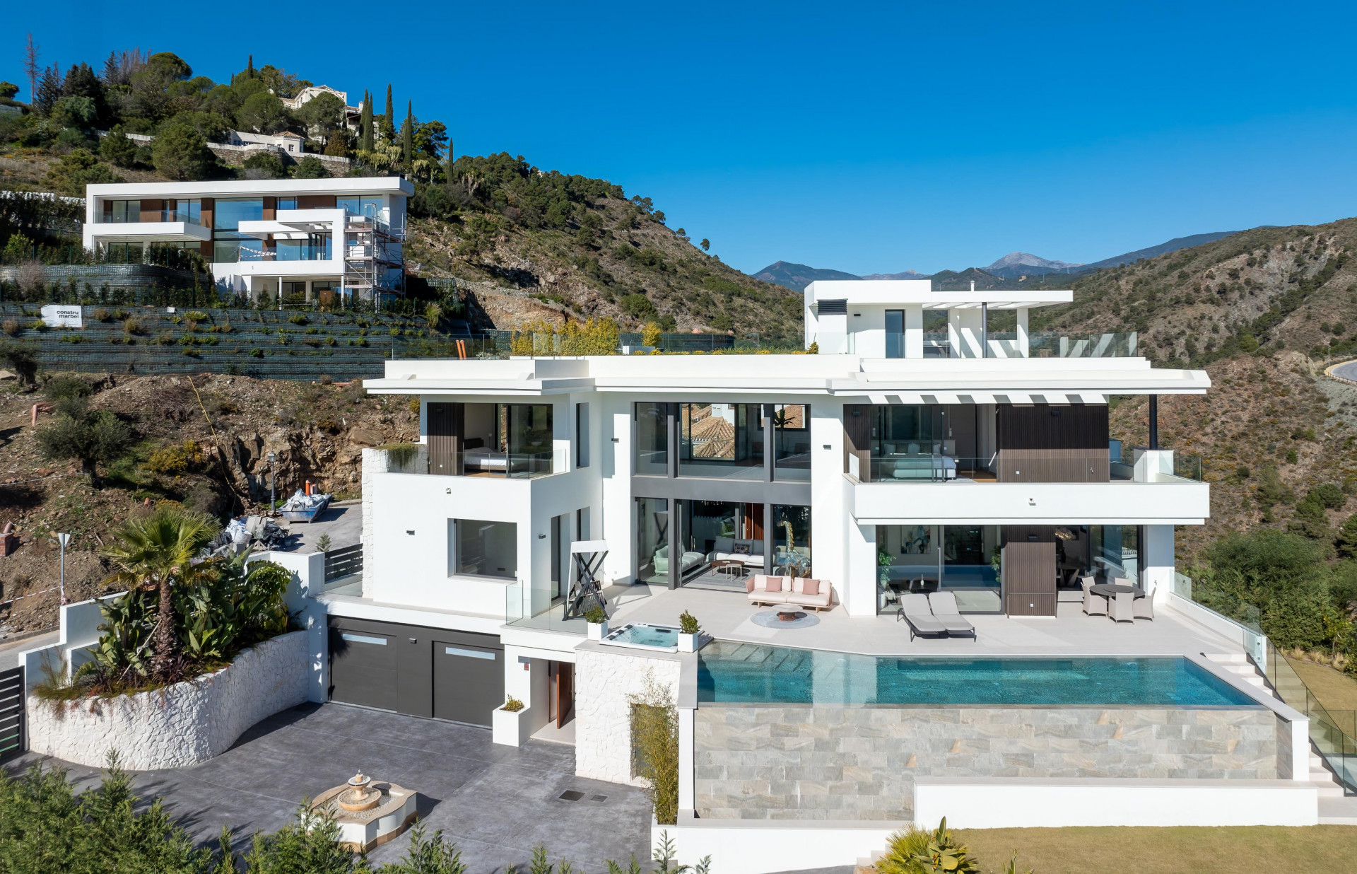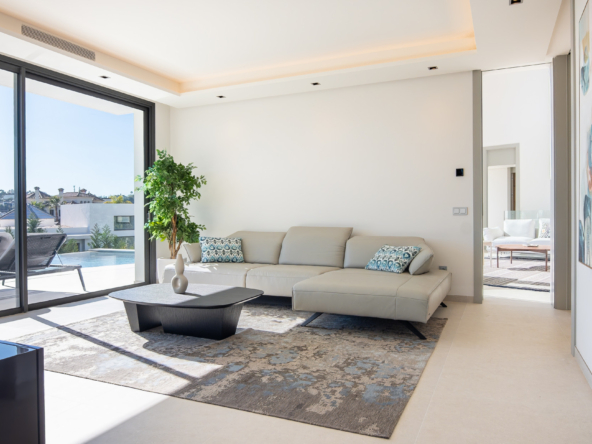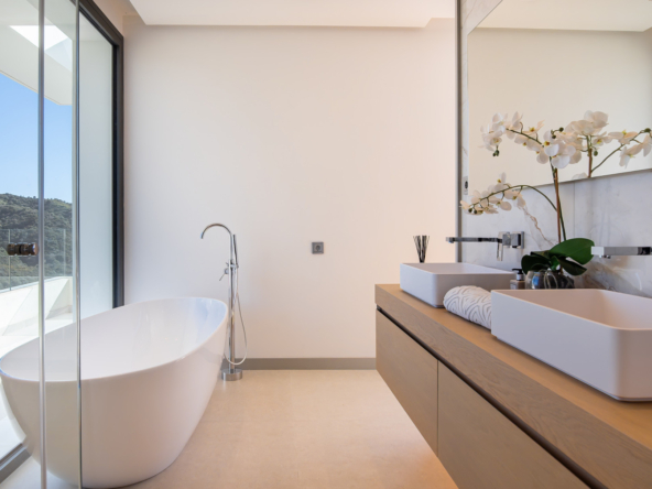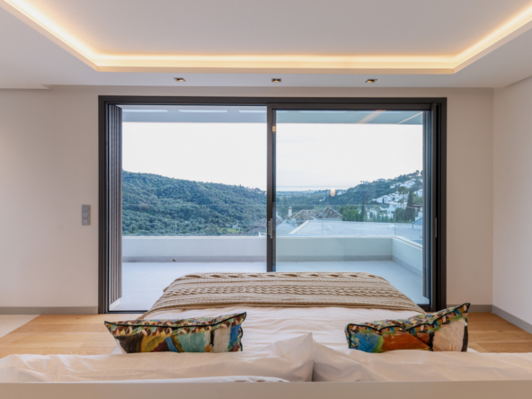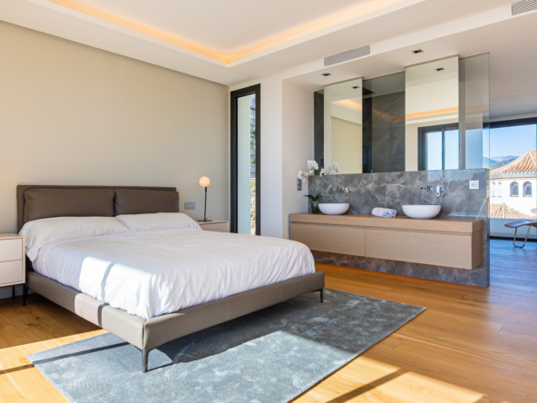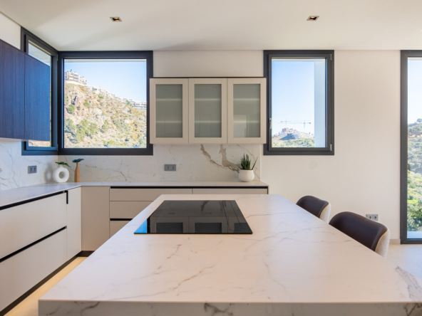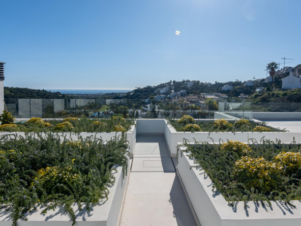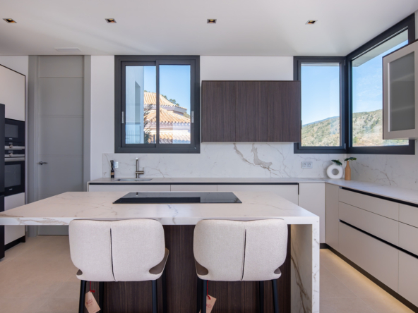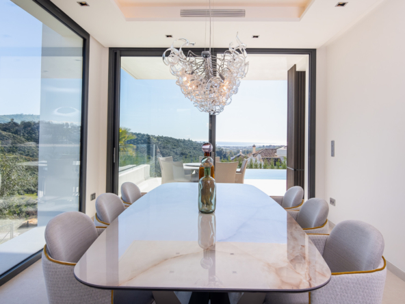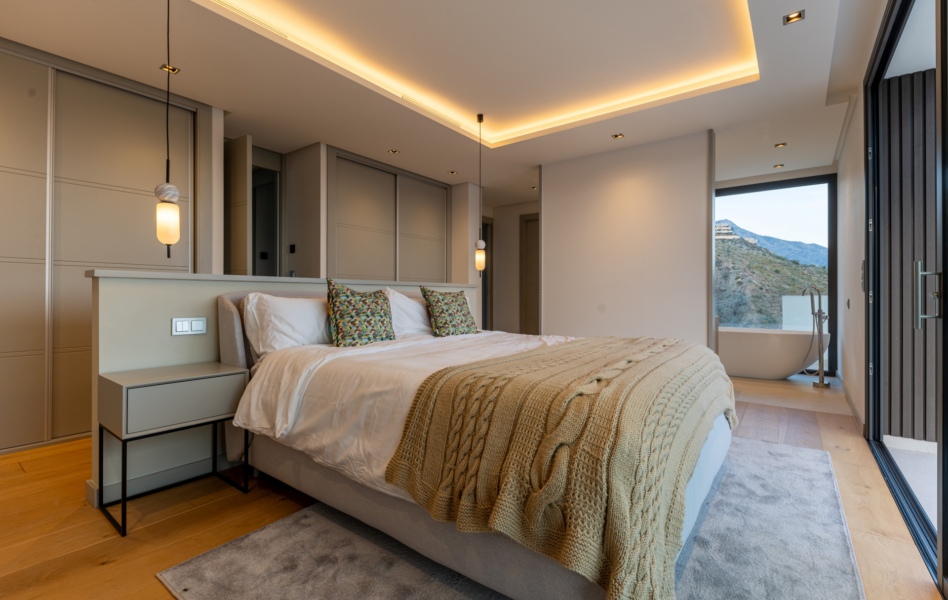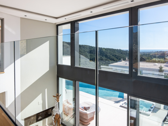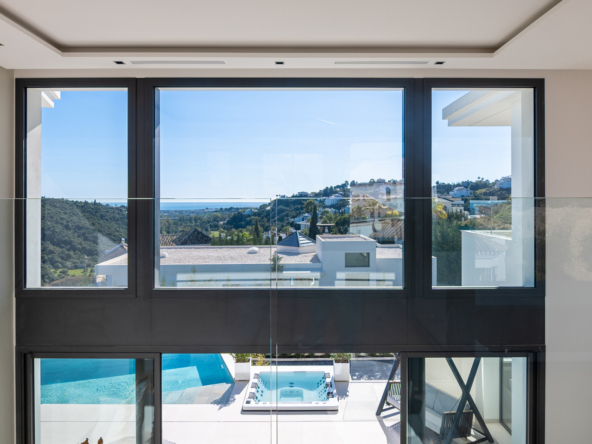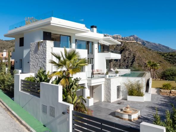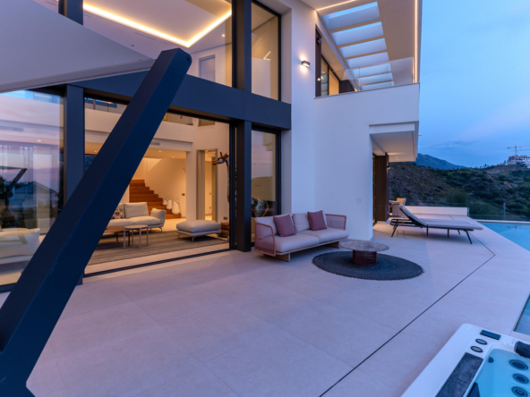 The villa's exteriors are a true oasis, with two beautifully landscaped gardens offering breathtaking views of both the sea and the mountains. The main terrace features a saltwater swimming pool and jacuzzi, ideal for relaxing while enjoying the scenery. In addition, the solarium offers 360º views, from the sea to the surrounding golf courses and mountains, creating a perfect space for year-round enjoyment.