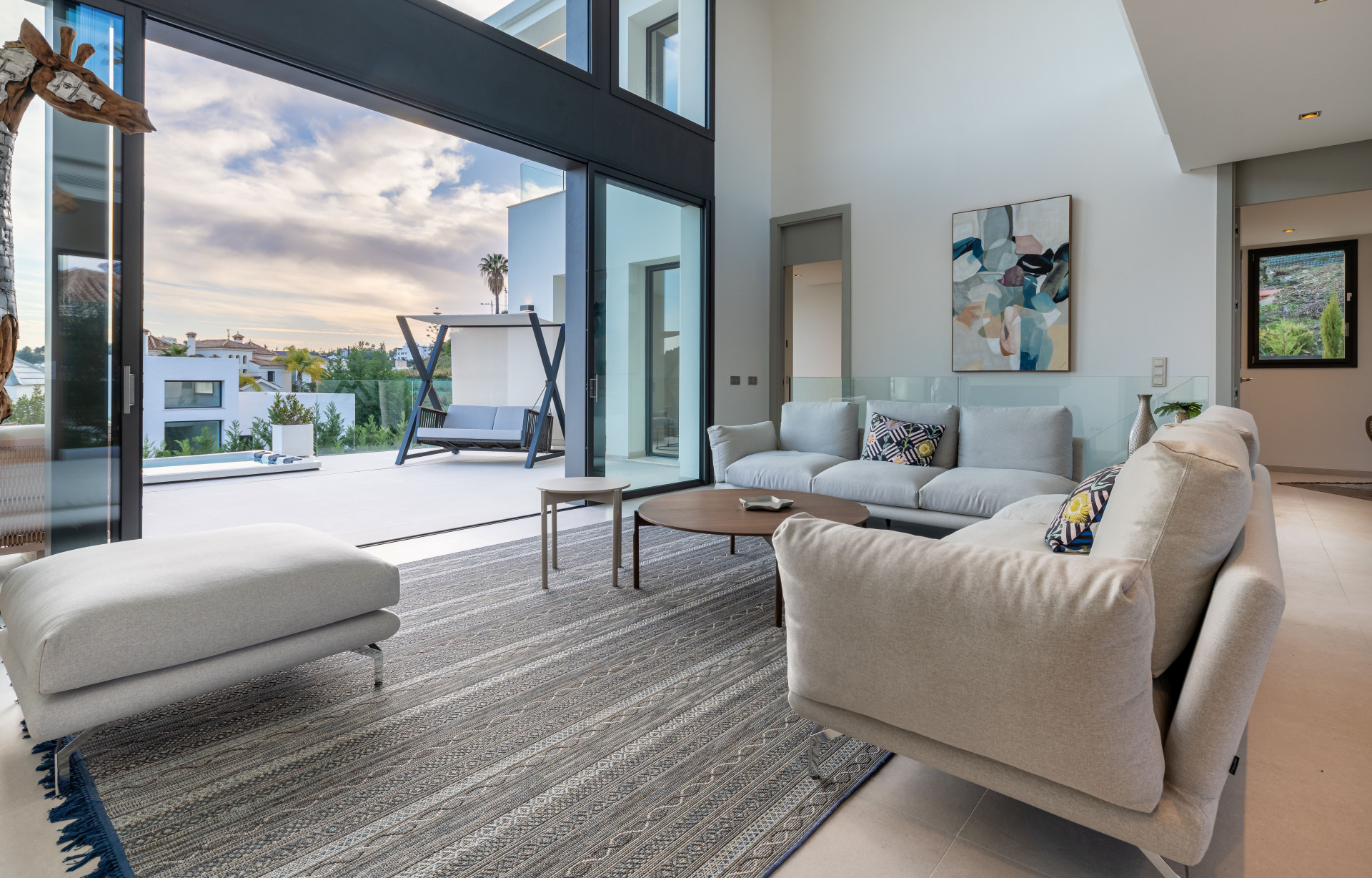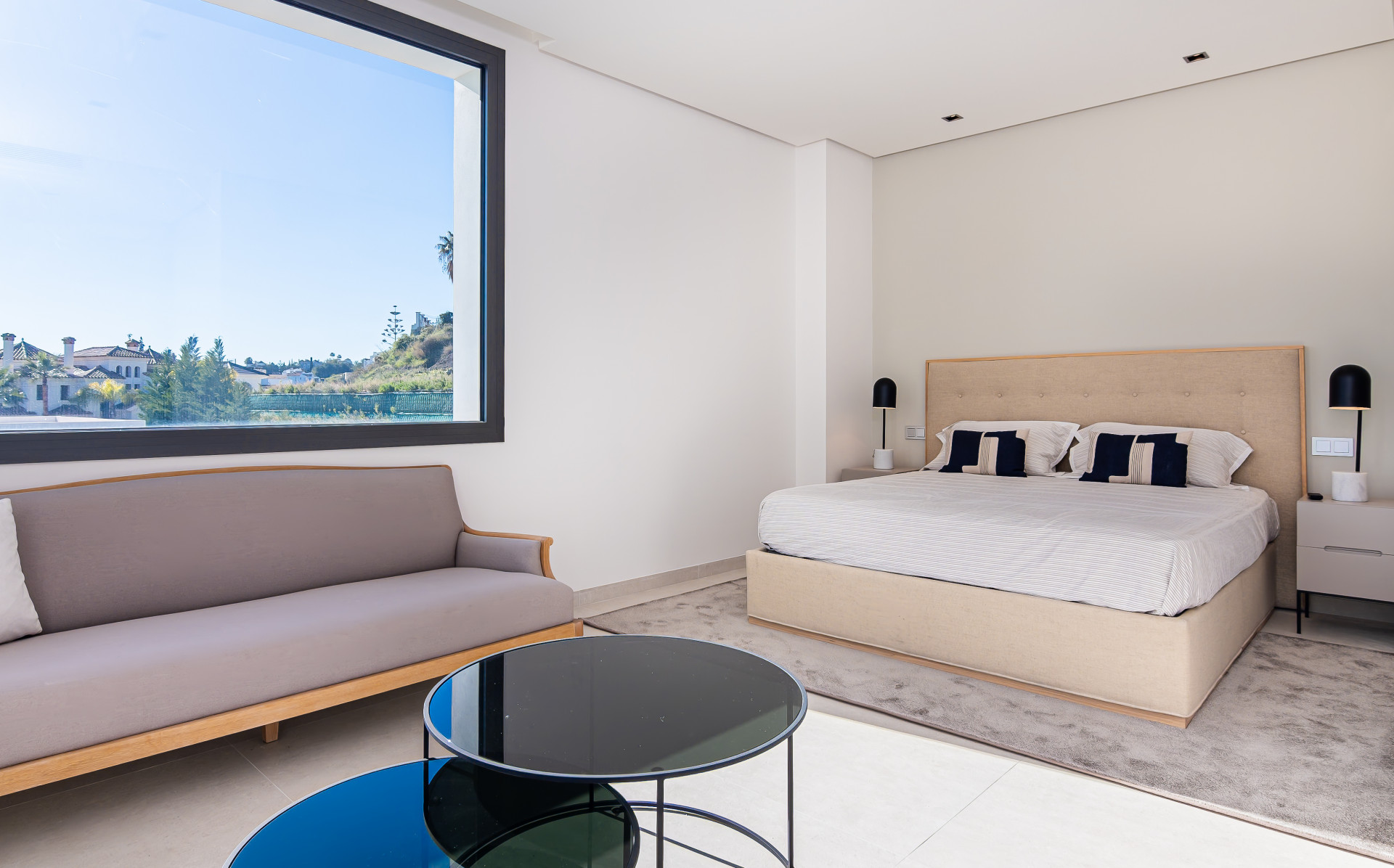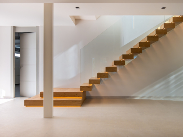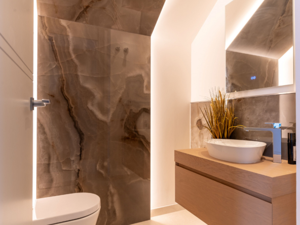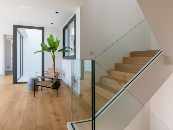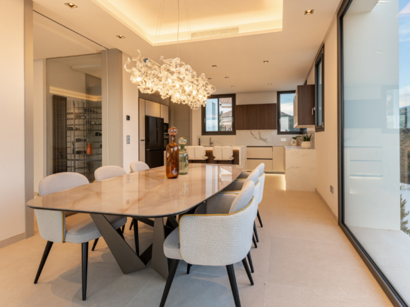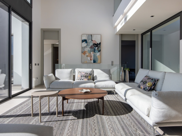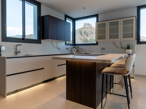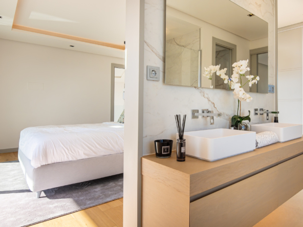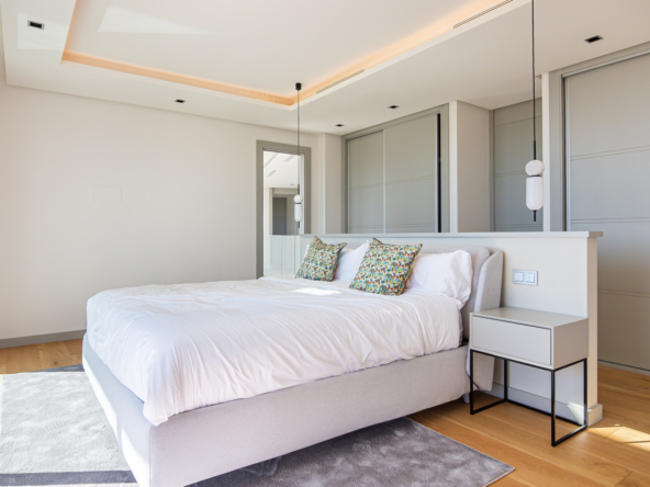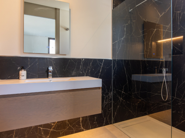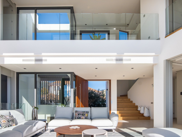 The interior of the property has been designed with a perfect balance between luxury and functionality. The main floor houses two bright living rooms with sea views and a modern, fully equipped kitchen. On this level, there are also two spacious guest bedrooms. On the upper floor, the master suite with en-suite bathroom offers privacy and spectacular views, accompanied by two further guest bedrooms, also with en-suite bathrooms.